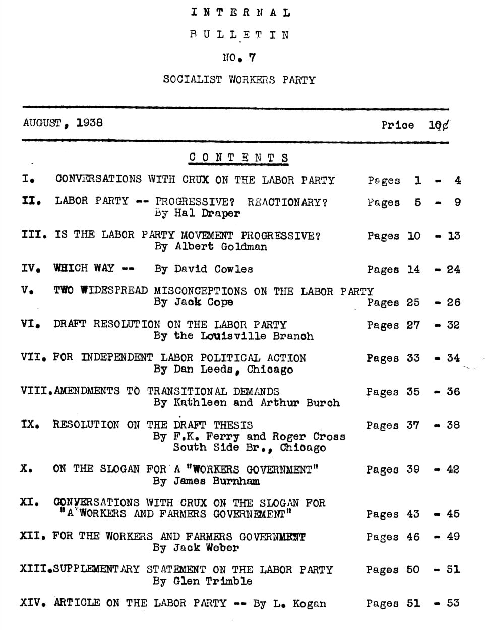Contents: Conversations With Crux (Trotsky) On The Labor Party, Labor Party Progressive? Reactionary? by Hal Draper, Is The Labor Party Movement Progressive? by Albert Goldman, Which Way by David Cowles, Two Widespread Misconceptions On The Labor Party by Jack Cope, Draft Resolution On The Labor Party by the Louisville Branch, For Independent Labor Political Action by Dan Leeds Chicago, Amendments To Transitional Demands by Kathleen and Arthur Burch, Resolution On The Drat Thesis Pages by F.K. Ferry and Roger Cross South Side Br., Chicago, On The Slogan For “A Workers Government” by James Burnham, Conversations With Crux (Trotsky) On The Slogan For “Workers And Farmers Government”, For “Workers And Farmers Government” by Jack Weber, Supplementary Statement On The Labor Party by Glen Trimble, Article On The Labor Party by L. Kogan.