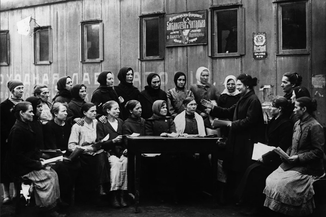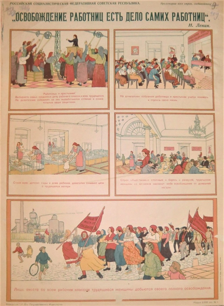 In Soviet Russia, propaganda through deeds for the ideas of communism means drawing women workers and peasants, housewives, and women employees into every area of Soviet construction, from the army and militia to activities for the liberation of women (communal kitchens, institutions of social education, protection of motherhood, etc.). It is particularly important at present to draw working women into all the efforts to rebuild the economy.