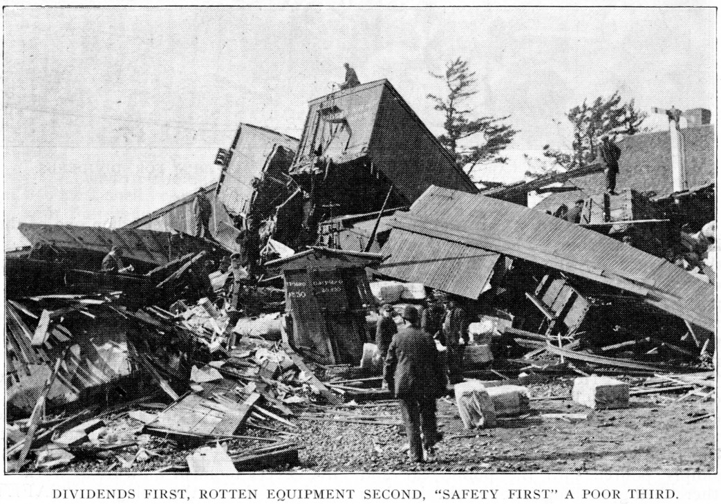 The “safety first” movement was born at the time when it dawned upon railroad profit seekers, that by throwing safety into the scrap pile profits could be made to grow ever more high, even after deducting the occasional expense occasioned by the inevitable wrecks. Then, of course, there was the claim agent and lawyer always ready to reduce even these claims to the lowest limit. “Safety first” became a wonderful asset and has been used to the very limit as a cloak, and it must be said with success.