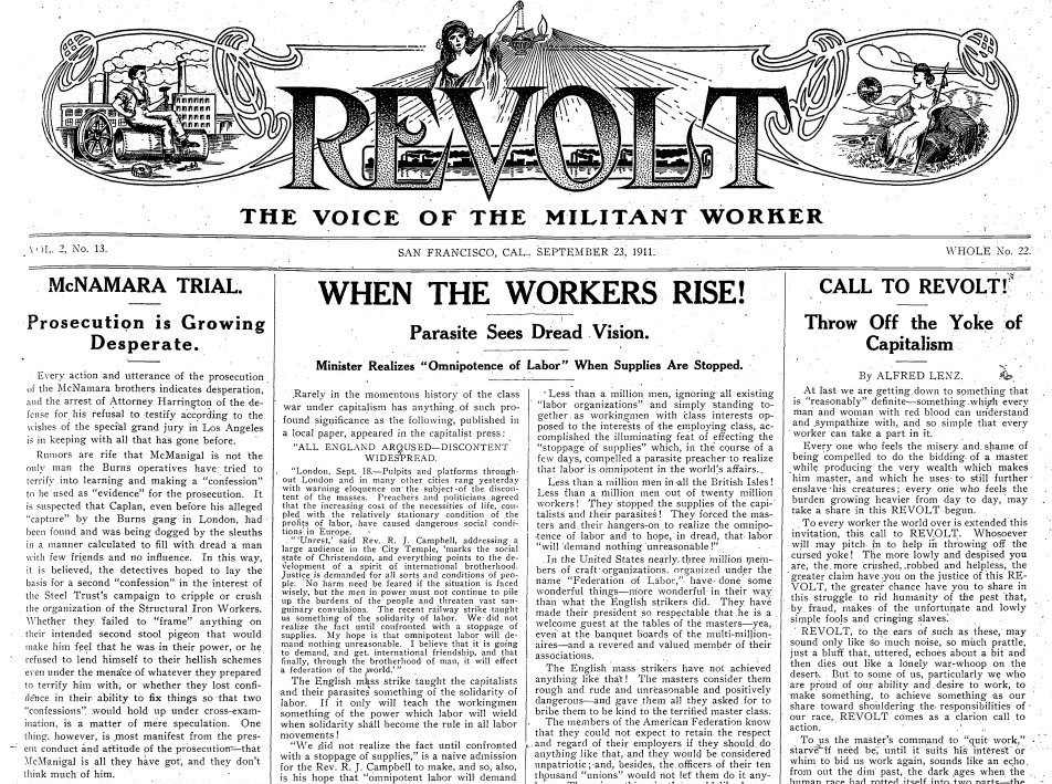 Revolt ‘The Voice Of The Militant Worker’ was a short-lived revolutionary weekly newspaper published by Left Wingers in the Socialist Party in 1911 and 1912 and closely associated with Tom Mooney. The legendary activists and political prisoner Thomas J. Mooney had recently left the I.W.W. and settled in the Bay. He would join with the SP Left in the Bay Area, like Austin Lewis, William McDevitt, Nathan Greist, and Cloudseley Johns to produce The Revolt. The paper ran around 1500 copies weekly, but financial problems ended its run after one year. Mooney was also embroiled in constant legal battles for his role in the Pacific Gas and Electric Strike of the time. The paper epitomizes the revolutionary Left of the SP before World War One with its mix of Marxist orthodoxy, industrial unionism, and counter-cultural attitude. To that it adds some of the best writers in the movement; it deserved a much longer run.