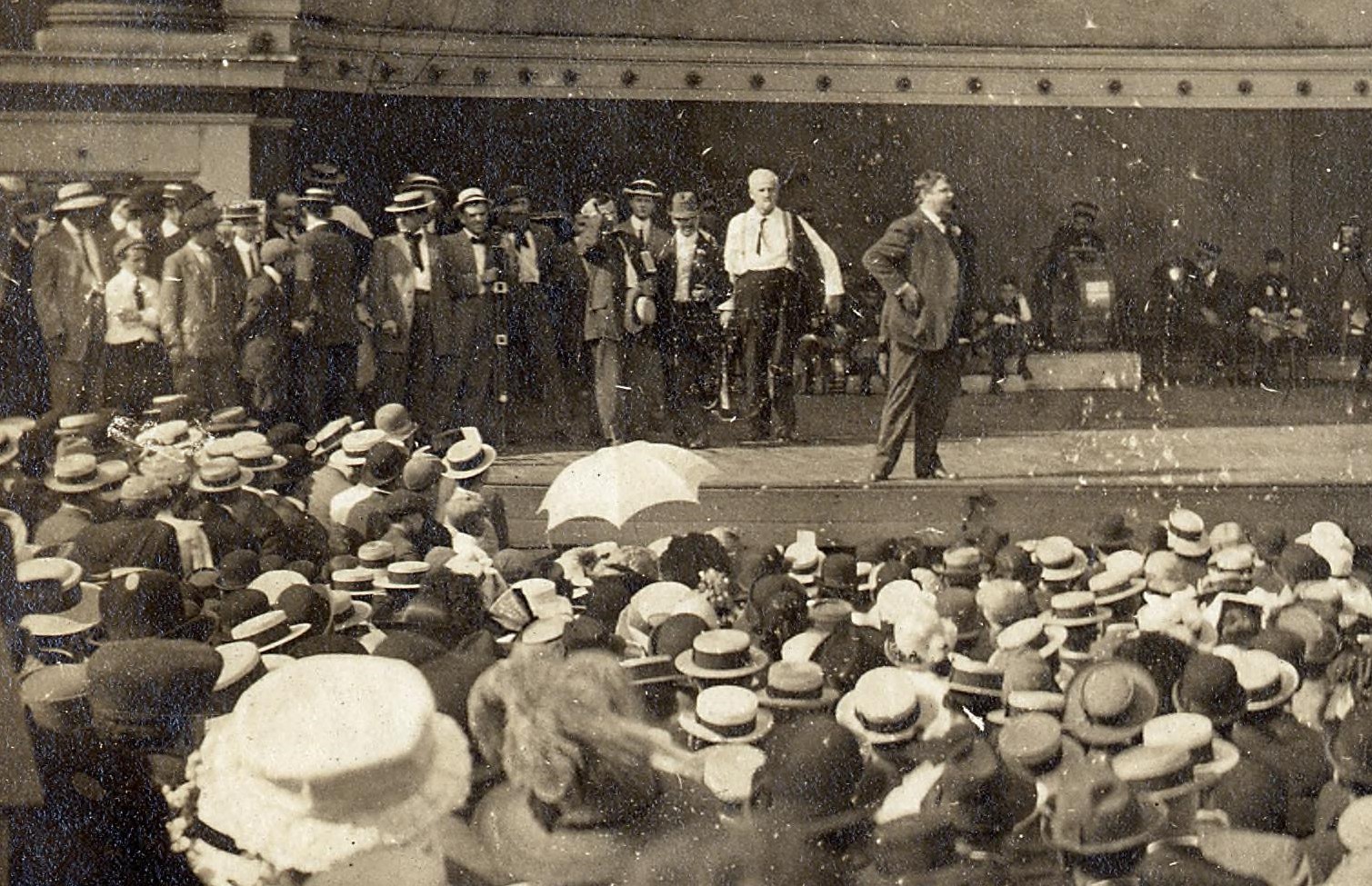 Now, are there any of you who feel that your interests and the capitalist’s interests are identical? Don’t you know that there is not an employing capitalist or corporation manufactory in this country that if it were possible would not operate his or its entire plant or factory by machines and dispose of every human being employed? (Applause). The corporation does not hire you. The employer never looks at your face; he never looks you in the eye. He cares nothing about your feelings. He does not care anything about your surroundings. He cares nothing about your twinges of anguish or your heartaches. He wants your hands and as much of your brain as is necessary to attach yourself to a machine. (Applause). Remember, that to-day there are no skilled mechanics. Down in the packing house there are no butchers. There is a train of specialized men that do just their part, that is all. The machine is the apprentice of yesterday; the machine is the journeyman of to-day. The machine is rapidly taking your place, and it will have you entirely displaced pretty soon, and it is a question as between you and the capitalist as to who is going to own and control and manipulate and supervise that machine. (Applause.)