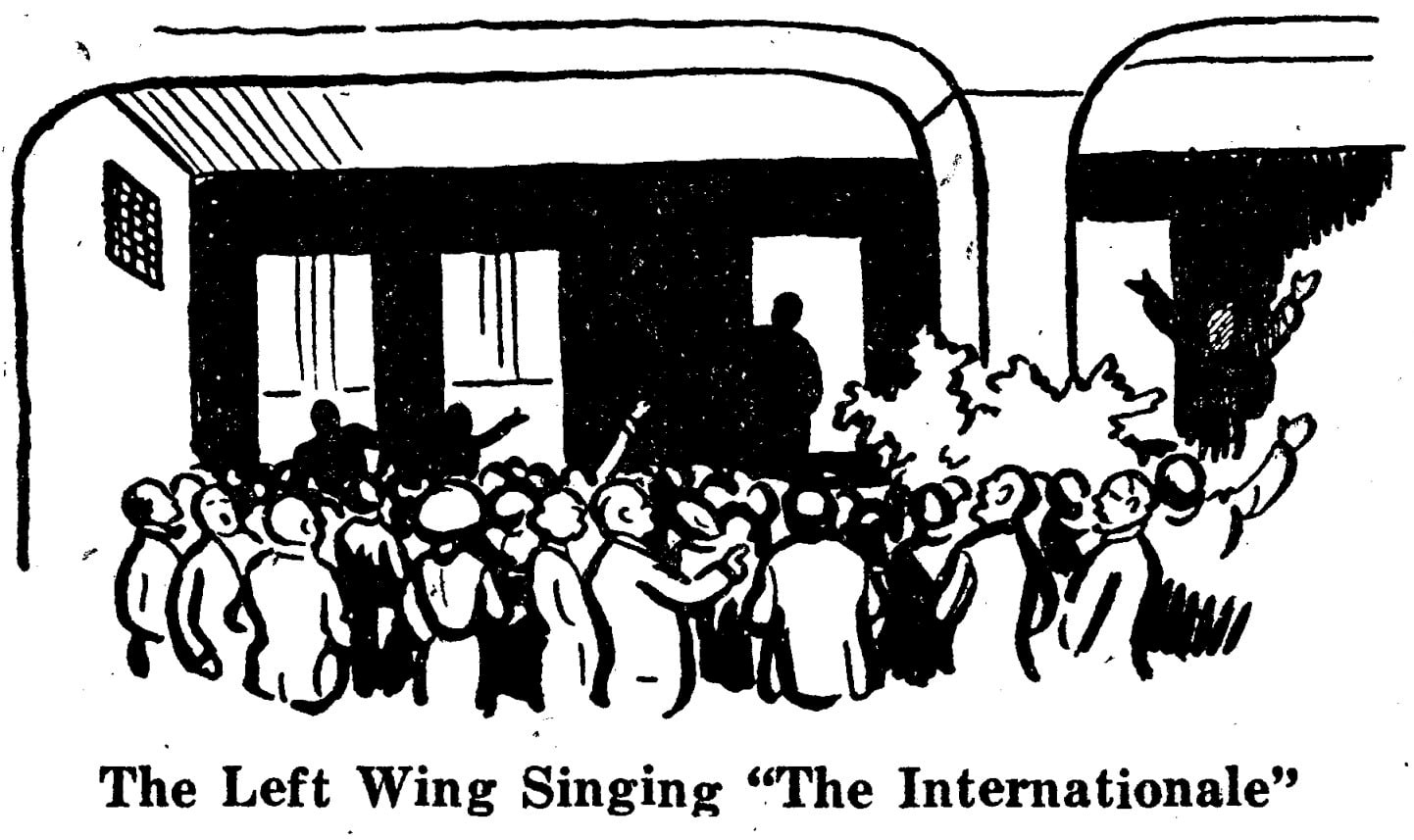 The Convention went through its three sessions of May 18th without a word of curiosity about the bolters, and with relief from their silly tactics of time-killing and obstruction. The opposition to the Left Wing expressed itself in debate and questioning; and the opportunity for real discussion was never cut off by the Left Wing. About all the writer heard of the bolters was that they started a meeting in a nearby hall, but soon came to the conclusion that no one knew what they wanted to do. It was quite apparent that all except the most conspicuous figures finally found their way back to the Convention.