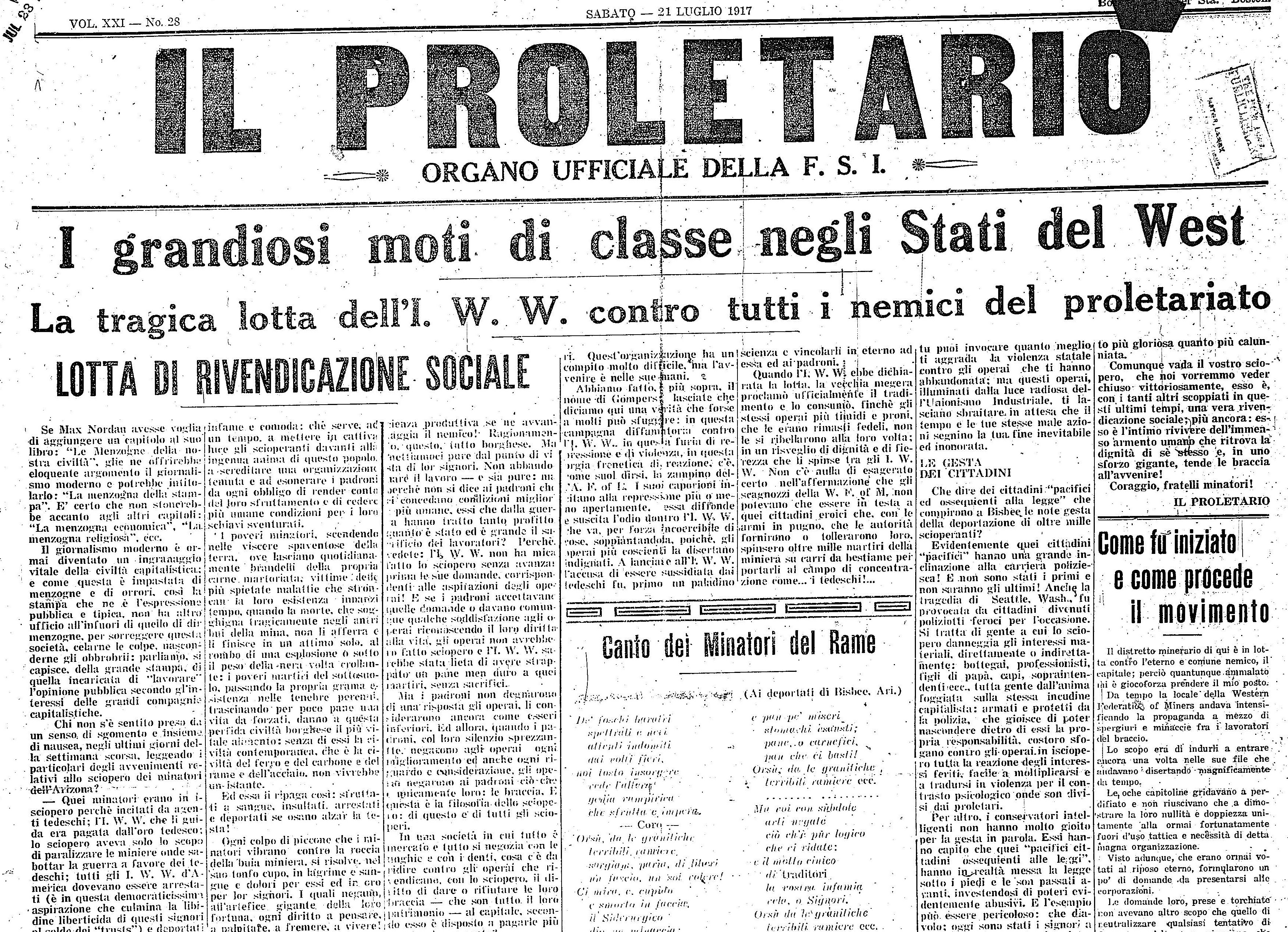 Il Proletario (Chicago). Vol. 21 No. 28. July 21, 1917.