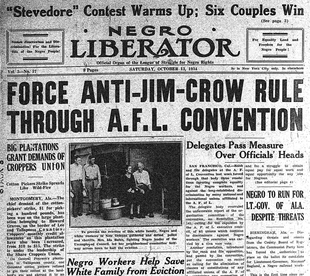 The Liberator was the paper of the League of Struggle for Negro Rights, largely edited by Benjamin Davis and begun in 1930. In 1932, its name changed to the Harlem Liberator, an again to the Negro Liberator before its run ended in 1935. The editorial board included William Patterson, James W Ford, Robert Minor, and Harry Haywood. Printed, mostly, every two weeks, The Liberator is an important record not only of radical Black politics in the early 1930s, but the ‘Harlem Renaissance’ as well. The successor to the American Negro Labor Congress, The League of Struggle for Negro Rights was organized by the Communist Party in 1930 with B.D. Amis was the LSNR’s first General Secretary, followed by Harry Haywood. Langston Hughes became its President in 1934. With the end of the Third Period and the beginning of the Popular Front, the League was closed and the CP focused on the National Negro Congress by 1935. The League supported the ‘Self-Determination for the Black Belt’ position of the Communist Party of the period and peaked at around 8000 members, with its strongest centers in Chicago and Harlem. The League was also an affiliate of the International Workers Order.