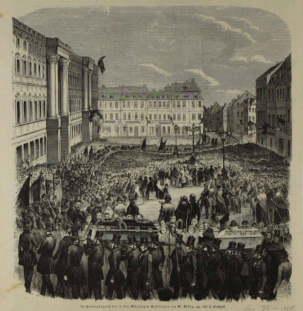 Berlin had begun to ferment and boil at the moment when the revolutionary tidings had arrived from Paris. The news from Vienna encouraged the people, intimidated the government. The king granted the convocation of the united Landtag, on which the liberal bourgeoisie of that day placed great hopes — and also abolished the censorship. The “Royal Patent” which convoked the Landtag appeared on March 18. There was great jubilation. Note the date! In the afternoon thousands of persons moved toward the palace to thank the king. Suddenly, mounted dragoons forced their way into the crowd, and a detachment of soldiers with bayonets lowered advanced from the palace. There are shots and hits. Who had given the order? The voice of the people named the man — our so-called historians have been working for forty-two years to conceal him.