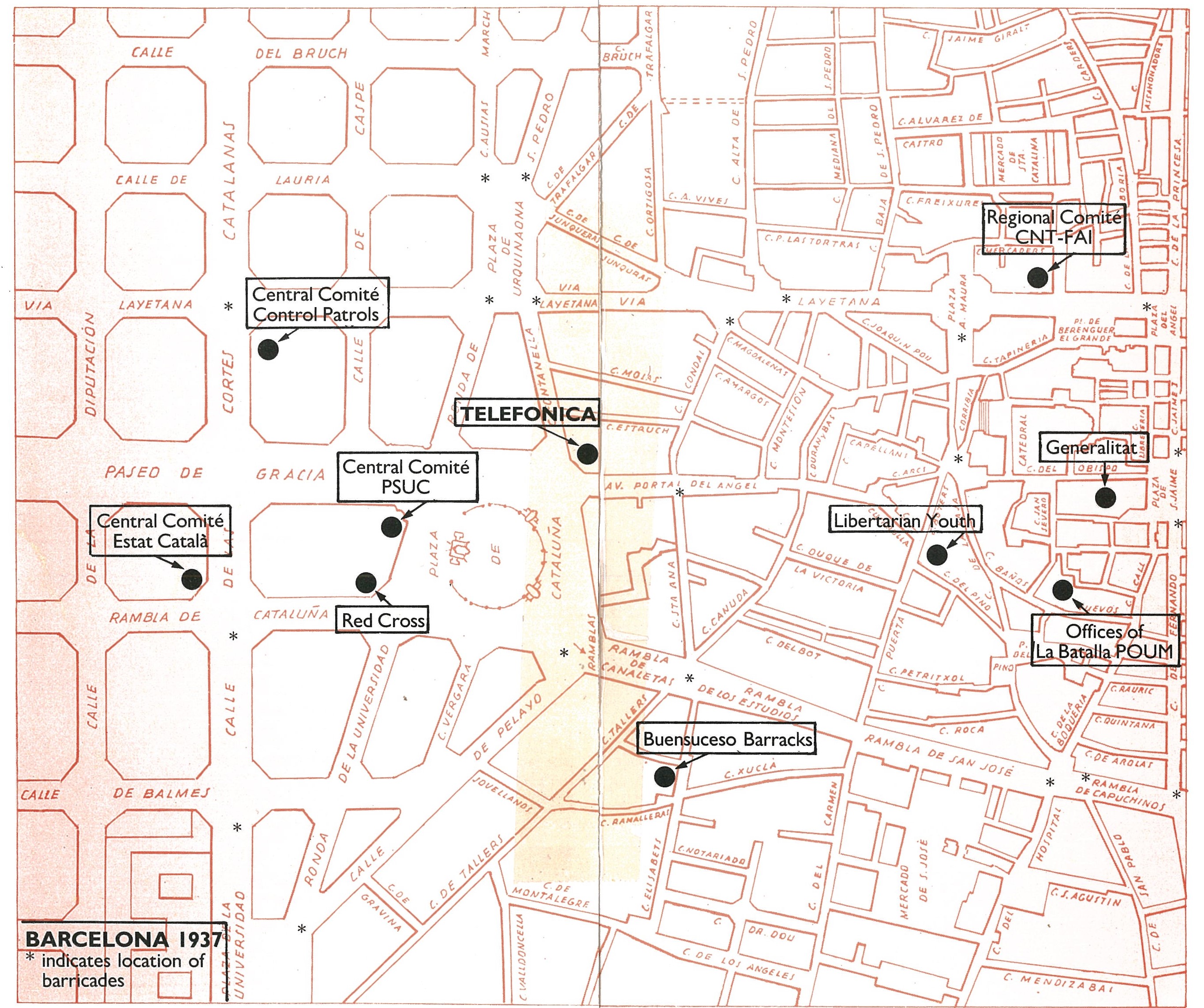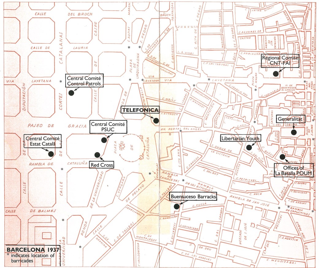 Monday, May 3rd, at 3 p.m., Assault Guards, under the command of Rodriguez Sala, Commissar of Public Order and P.S.U.C. member, tried to take the Telephone Building in the Plaza Cataluna by force. The occupation was supported by a heavy detachment of armed men, both police guards and cavalry. For ten month the Telephone Building had been under the control of a trade union committee of members of the U.G.T. and the C.N.T., and its protection against any fascist aggression was assured by the militia of these organizations. In regard to censorship and technical questions, the committee in charge was always at the disposal of the Generality.