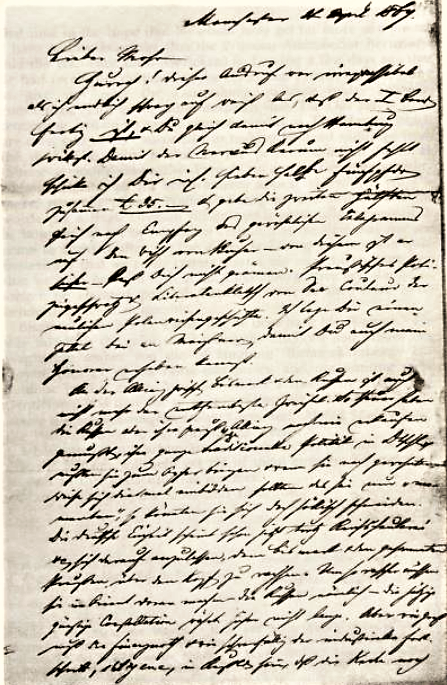 The first letters in the group were from Engels in 1844-1845 and they were written in western Germany. They give a general view of the communistic movement as it developed there. He tells how he meets comrades everywhere, and that he is constantly surprised to find people who, apparently without any special influence, have formed communistic clubs. So that the ideas that scarcely a year before were not known are now subjects for lively discussions in books and articles, in newspapers and magazines. The first agitation had to be carried on quietly from man to man, but very soon public meetings were held that caused great attention. Engels writes in a letter in February, 1845 “We held a meeting yesterday in the city’s finest hall, in the finest hotel, which was our third communistic meeting. Forty people came to our first meeting, and to the second we had 130, and at the third there were at least 200. The whole of Eberfeld and Barmen, from the money aristocrat to the small merchant, was represented, but the workers remained away. We talk about nothing but communism and each day brings us new followers.”