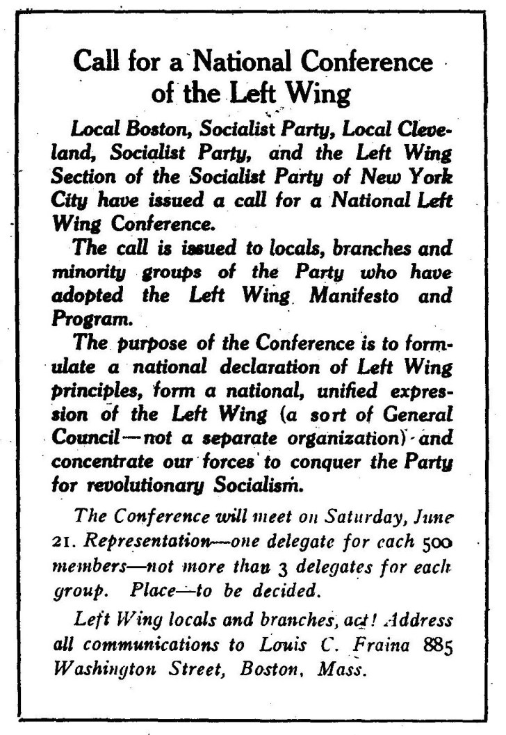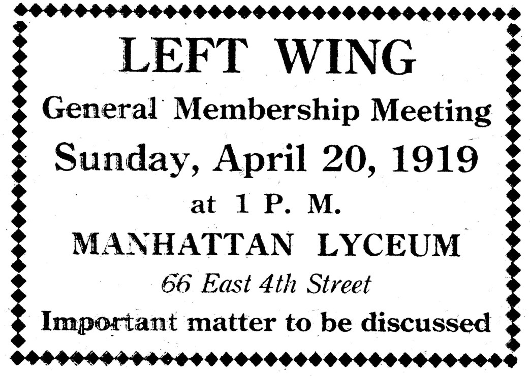 Heading toward a split in the Socialist Party, by the spring of 1919 the Left Wing began to coalesce and formalize nationally. In many locales, and among activists across the country, the emerging Left Wing constituted the majority of the Party. Here is a detailed treasure, an historic snapshot of our movement picturing that time with a report, minutes and elections recorded of an 800-person meeting by New York City’s Left held on April 20, 1919 at the Manhattan Lyceum. The steering committee chosen at the end of the meeting included John Reed, Ben Gitlow, Max Cohen, Isaac Hourwich, Joseph Brodsky, Carl Brodsky, and Eamonn MacAlpine. All to be founders of the U.S. Communist Part(ies) by the end of the year.