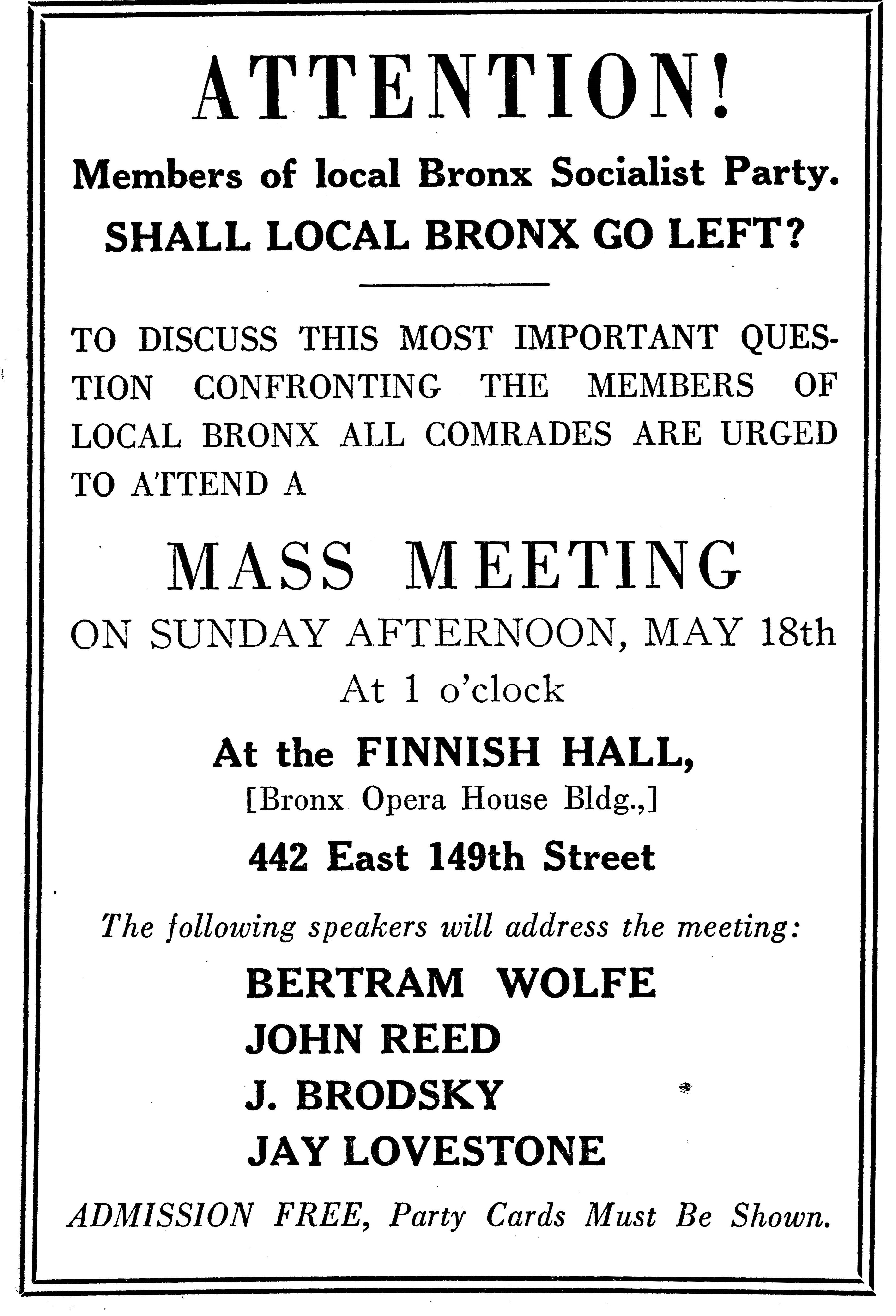 7th- New York Executive Committee resolution to instruct the membership of Greater New York to send full quota of delegates to the Conference of the Left Wing Section to be held in Boston in June. Resolution accepted.