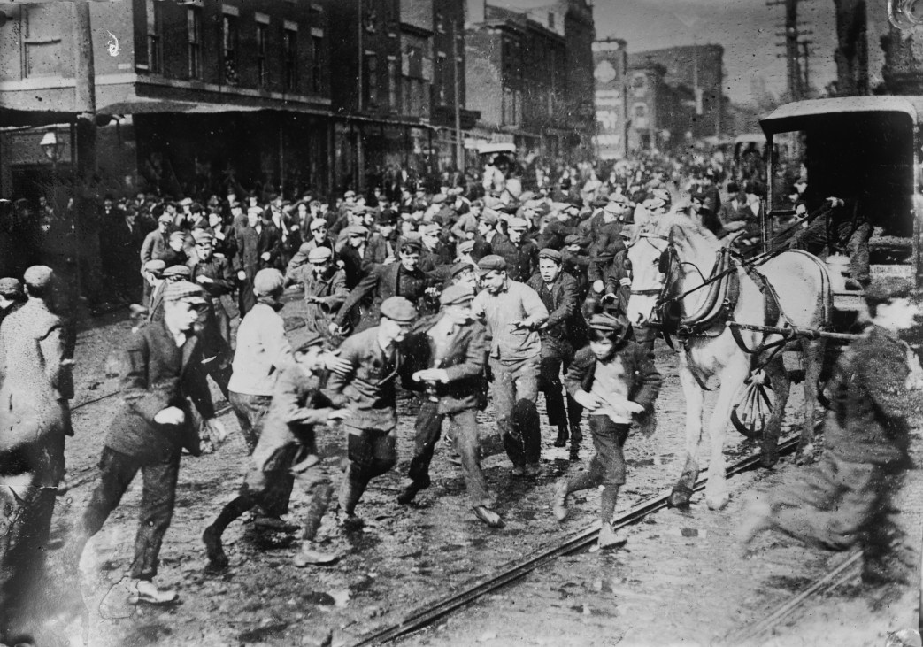 Belgian blocks and culvert lids are piled up at the intersection of two streets. A car comes along. It stops at the obstruction. A volley of bricks and stones shatter every pane of glass. The policeman on the car throws up his hands and joins the crowd. The motorman follows suit. His coat and hat are ripped from him but he is not otherwise molested. The conductor tries to run away. In a minute he is writhing in the street from a shower of blows. He staggers to his feet, blinded by the blood which spurts from a gash in his forehead. He runs about like a trapped rat. A hundred hostile arms are raised against him. The crowd closes in. Again he is down in the dirt, being pummeled and kicked. He no longer stirs.