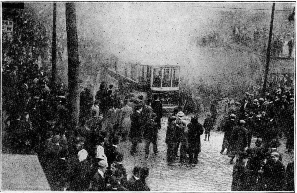 The “riot call ” brings the chief of police and a hundred of his men. They try to drive the crowd back. The mounted men force their horses upon the sidewalk and against the women and children. The crowd is urged up into the cross streets, back and back, but it trickles through the cordon of police to the scene of disorder. By this time one of the company’s repair wagons has put the car into shape again. It is returned to the barn under the care of a troop of police. The company makes known its intention to run no more cars in the district. Rain begins to fall. The crowd disperses.