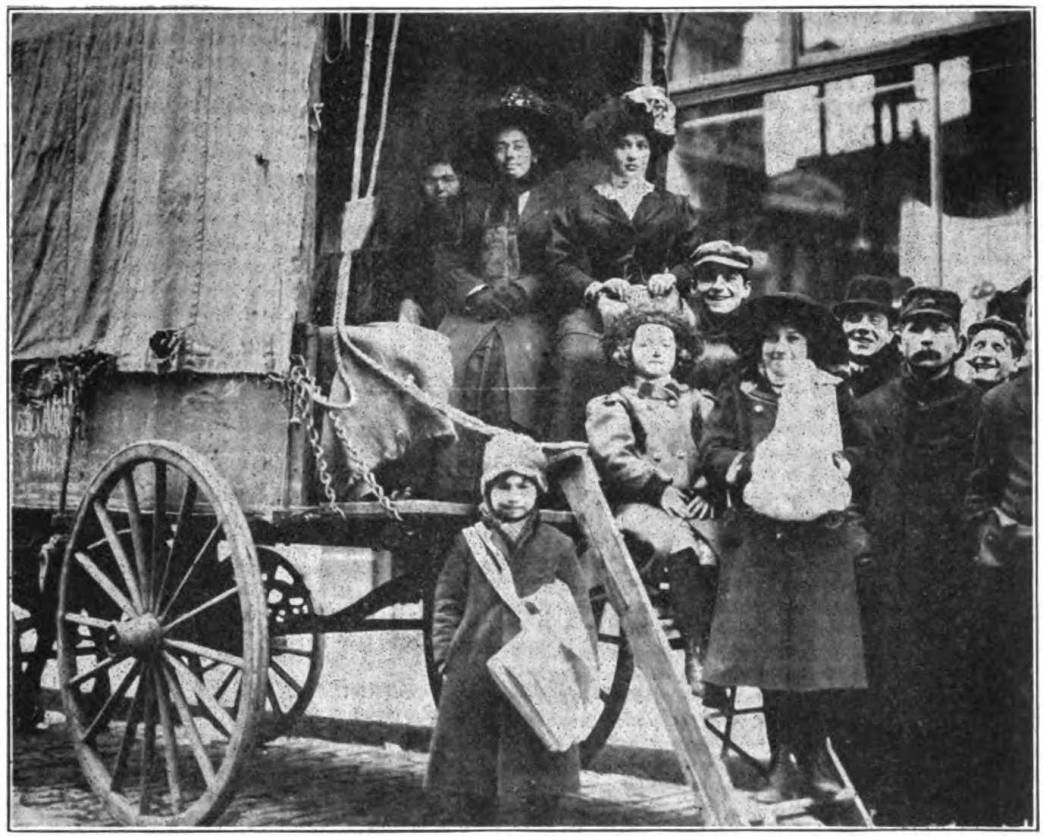 The people refrained from patronizing the scab-manned cars and let it go at that. Without standing upon the formality of organizing a club, they began to walk to and from work. All manner of conveyances carried passengers and did a flourishing business. The director of public safety tried to put a stop to the vehicle traffic by having scores of the drivers arrested and fined, for doing a transportation business without a license. But the wagons continued to go “all the way up” or “out” or “down.” To circumvent the director, they displayed legends such as the following: “Charity Wagon,” “Free Ride,” “Union Transit.” Unnecessary to add, no one was discouraged from tendering the conductor a free will offering.