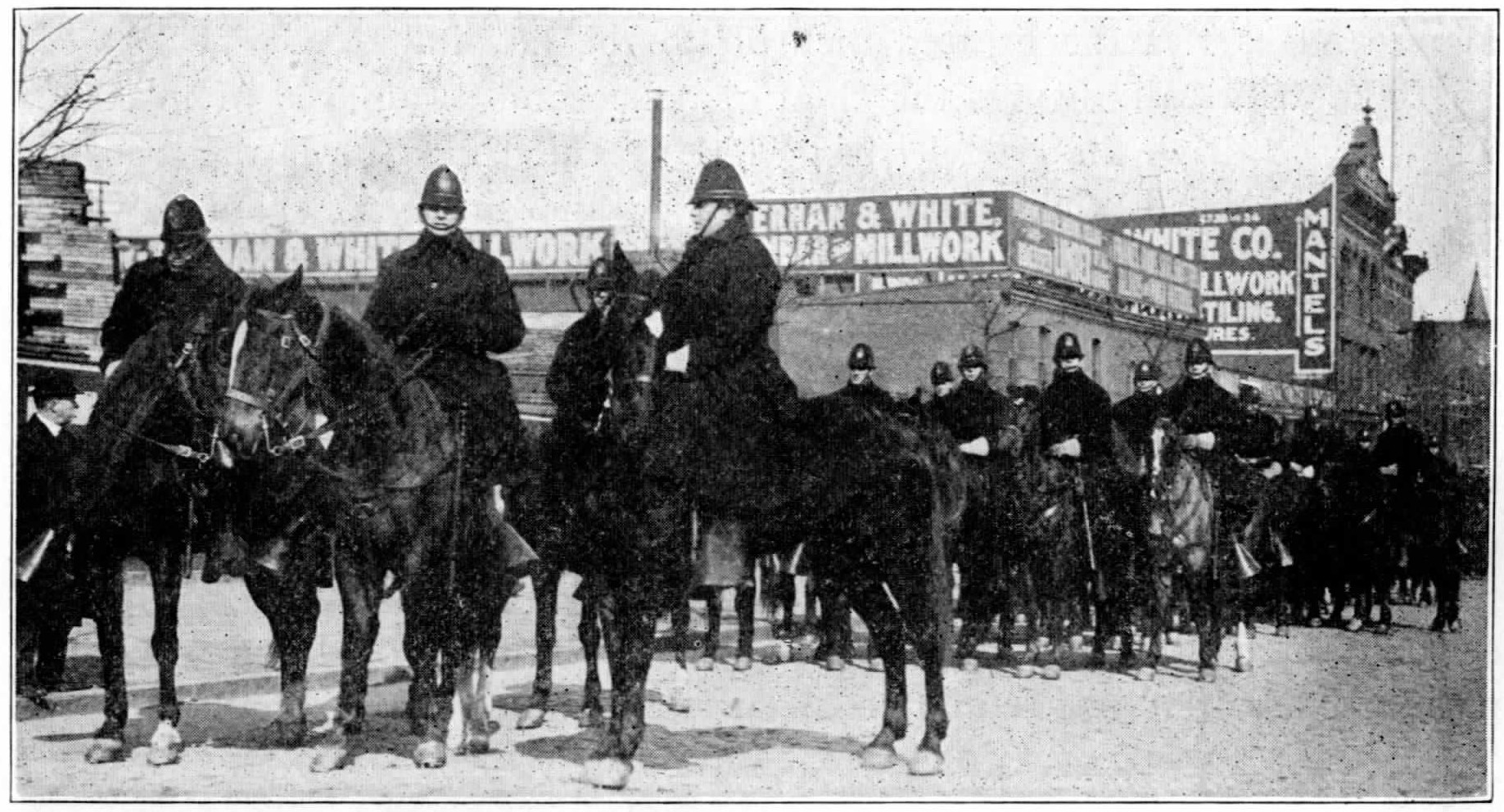 On February 23rd, Mayor Reyburn dispatched a telegram to Governor Stuart, asking for the state constabulary, or cossacks, as they are more popularly known. Four companies of them, 158 men all told, arrived next day and remained until March 1st.