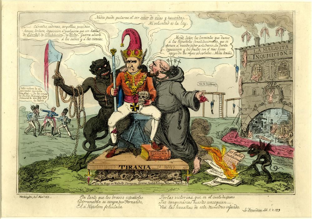In his decree, dated May 4, 1814, in which Ferdinand VII dissolved the Madrid Cortes and cancelled the Constitution of 1812, he simultaneously proclaimed his hatred of despotism, promised to convene the Cortes under the old legal forms, to establish a rational liberty of the press, etc. He redeemed his pledge in the only manner which the reception he had met on the part of the Spanish people deserved — by rescinding all the acts emanating from the Cortes, by restoring everything to its ancient footing, by re-establishing the Holy Inquisition by recalling the Jesuits banished by his grandsire, by consigning the most prominent members of the juntas, the Cortes and their adherents to the galleys, African prisons, or to exile; and, finally, by ordering the most illustrious guerrilla chiefs, Porlier and de Lacy, to be shot.