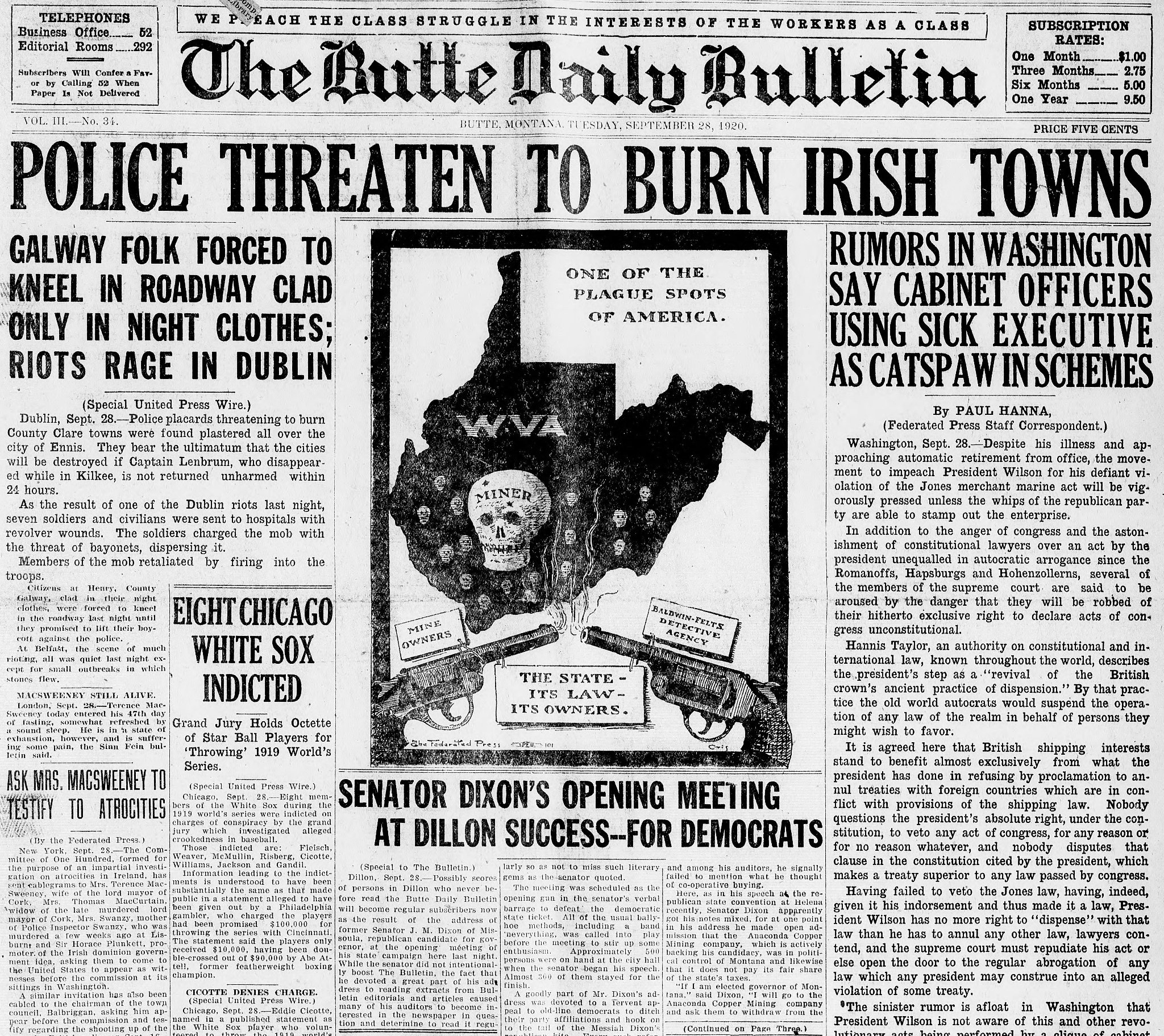 The Butte Daily Bulletin began in 1917 in reaction to the labor wars in Montana, the Speculator Mine fire killing 168 miners; IWW organizing, and the murder of IWW organizer Frank Little in Butte. Future Communist leader and IWW organizer William F. Dunne and R. Bruce Smith, president of the Butte Typographical Union published the paper as an outgrowth of a strike bulletin with the masthead reading, “We Preach the Class Struggle in the Interests of the Workers as a Class.” It became daily in August 1918 and in September 1818 officers raided their offices and arrested Dunne and Smith on sedition charges. An extremely combative revolutionary paper, while unaligned, it supported the struggles of the Left Wing in the SP, reflecting the large radical Irish working class of Butte also supported Ireland’s and the Bolshevik revolution, as well as the continued campaigns of the IWW locally and national as well as the issues in Butte. It ran until May 31, 1921.