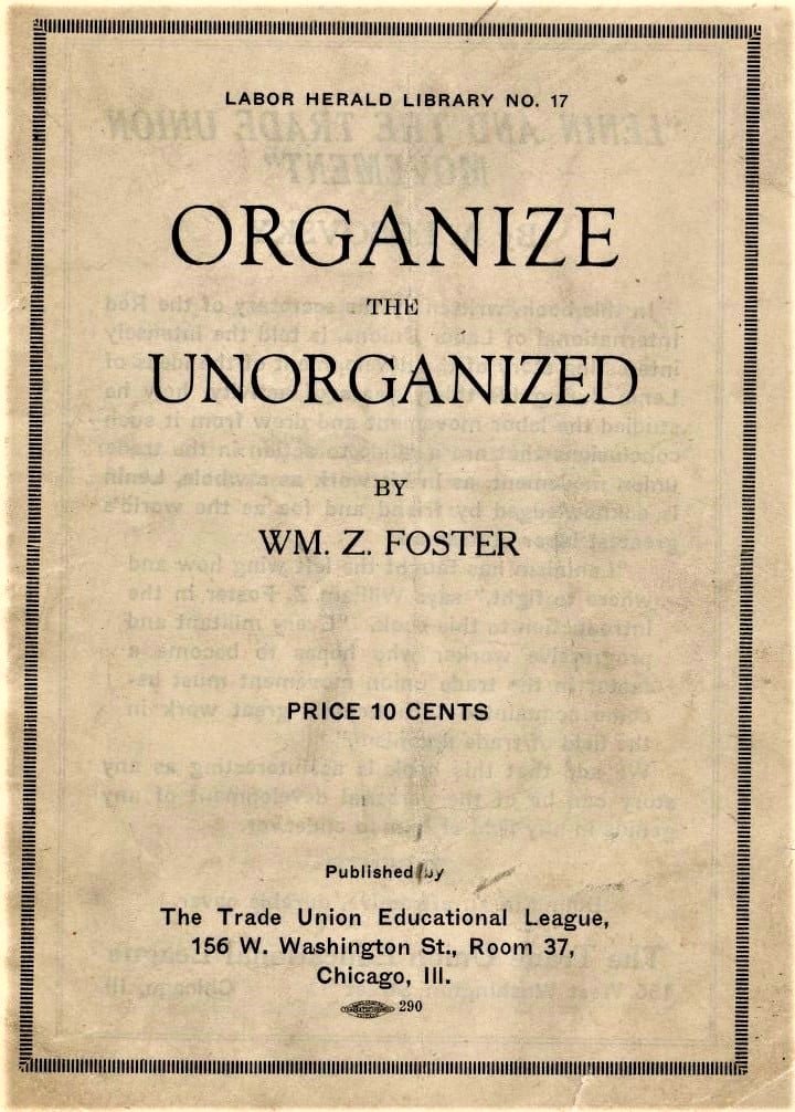 Organize the Unorganized by William Z Foster. Labor Herald Library No. 17. Published by the Trade Union Educational League, New York. 1926.