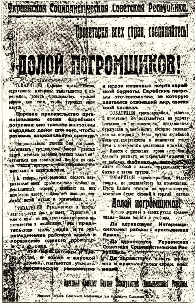 The text of a proclamation as from the the summer of 1919 urging war on pogromists and exhorting Reds (a small number undeniably also engaged in anti-Jewish violence) to reject entirely the message of Jewish hatred. During the Civil War(and before) the area around Odessa saw concerted pogroms against Jewish communities. That region saw tens of thousands of Jews murdered by counter-revolutionary White armies, likes those of Denikin, between 1918-1920. For much of this time the area was also a focus the imperialist Allie’s intervention, led by the French backing the pogromists and committing many atrocities of their own. Driven out by Red partisans on April 7, 1919, the Odessa Commune was proclaimed. Shortly long after this, in August, 1919 Denikin and his imperial patrons would retake Odessa until its final liberation by Red Army on February 8, 1920.