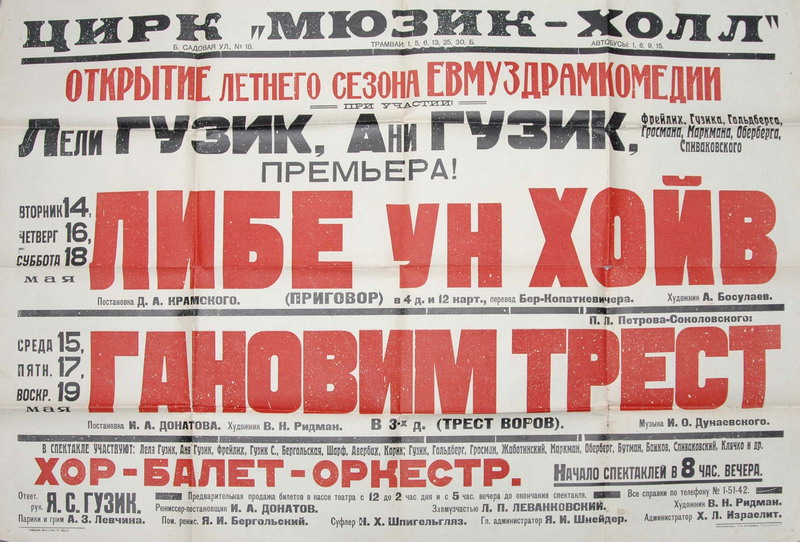 Kugel (homo novus), who is considered one of the best theatre and opera critics in Russia, former editor of the Russian Journal “Theatre and Art,” conducts a studio for Jewish opera in Petrograd. There are also Jewish state theatres in Kiev and in Odessa and Minsk.