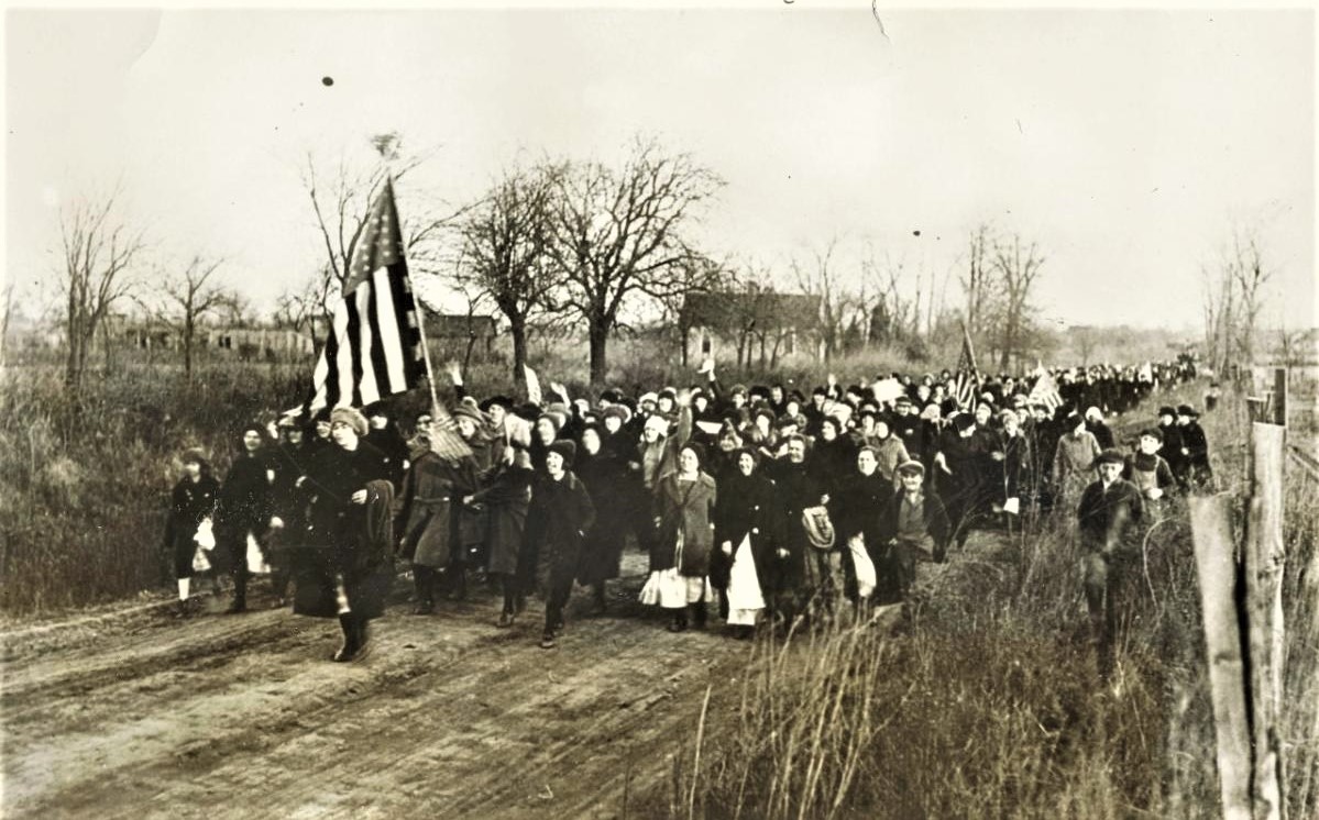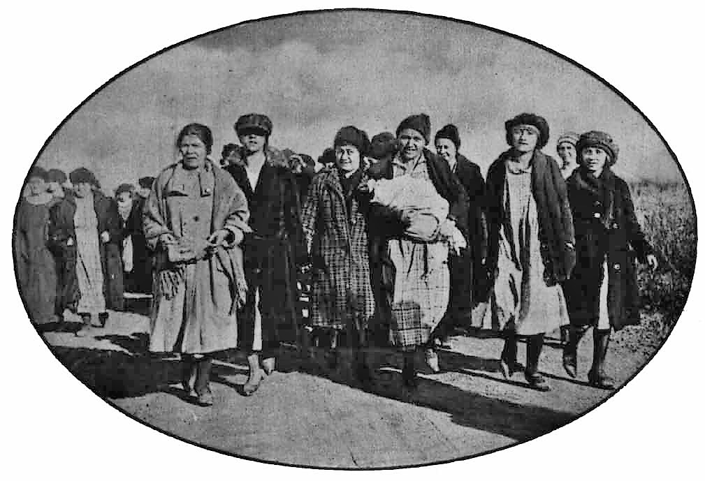 Three women got together and agreed, “We women must do something about this.” Of the original committee one was an American woman, one an Italian, and one a French woman. These women put a little advertisement in the paper. It stated merely that a women’s meeting would be held in a hall in the town of Franklin to discuss the situation. It was a women’s meeting- no men allowed. Old women and young women, women of all nationalities streamed to that little hall. They came miles by the Interurban Railways. They drove from remote mining camps. Mary Stuvitch- a woman of Montenegrin blood -proposed the idea that every woman at the meeting should get two other women to march and that each of these two women must get two other women. In two days time a procession of women was organized that took the flivers and motors carrying the women three hours to pass any given point. At their head rode a young French girl on a great roan horse.