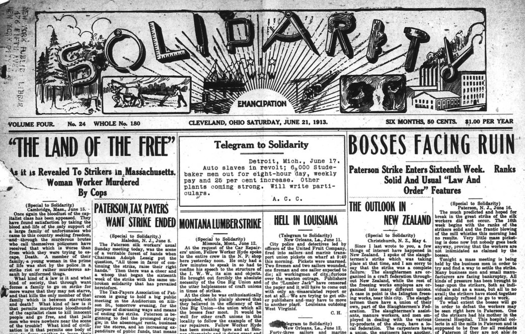 The most widely read of I.W.W. newspapers, Solidarity was published by the Industrial Workers of the World from 1909 until 1917. First produced in New Castle, Pennsylvania, and born during the McKees Rocks strike, Solidarity later moved to Cleveland, Ohio until 1917 then spent its last months in Chicago. With a circulation of around 12,000 and a readership many times that, Solidarity was instrumental in defining the Wobbly world-view at the height of their influence in the working class. It was edited over its life by A.M. Stirton, H.A. Goff, Ben H. Williams, Ralph Chaplin who also provided much of the paper’s color, and others. Like nearly all the left press it fell victim to federal repression in 1917.
