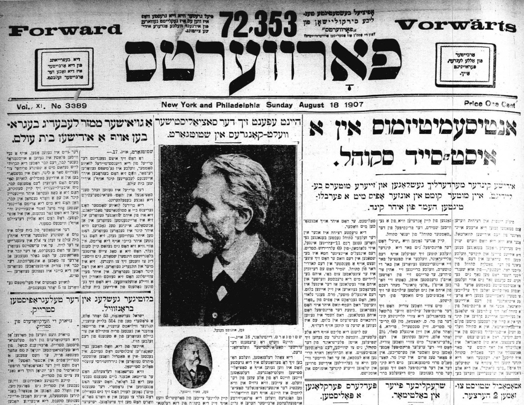 Forṿerṭs פארװערטס (New York City). Vol. 11 No. 3389. August 18, 1907.