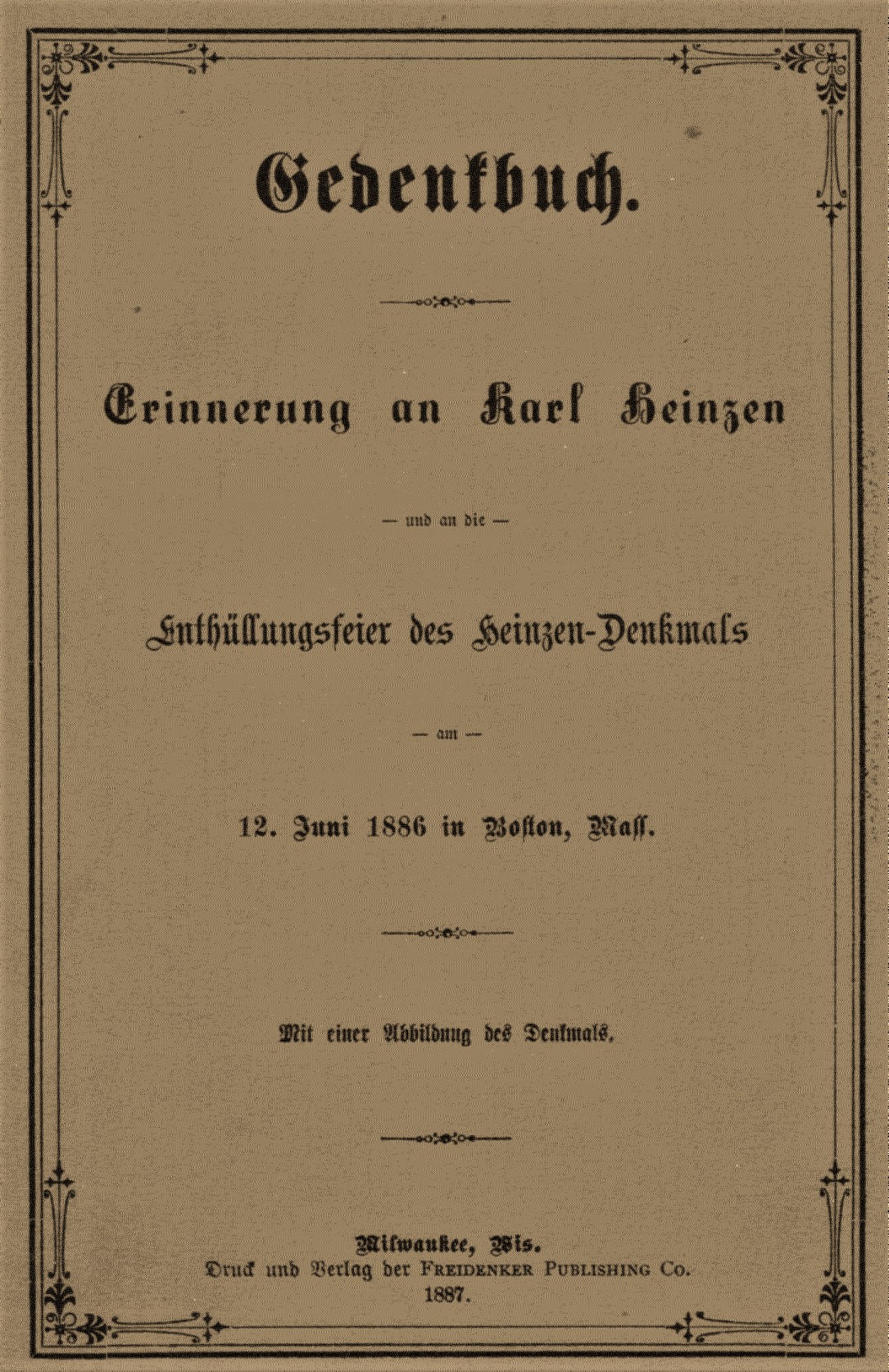 Memorial Book. Commemorating Karl Heinzen and the Unveiling Ceremony of the Heinzen Monument June 12, 1886 in Boston, Mass. Milwaukee, Wis. Printed and Published by the Freedenker Publishing Co. 1887.