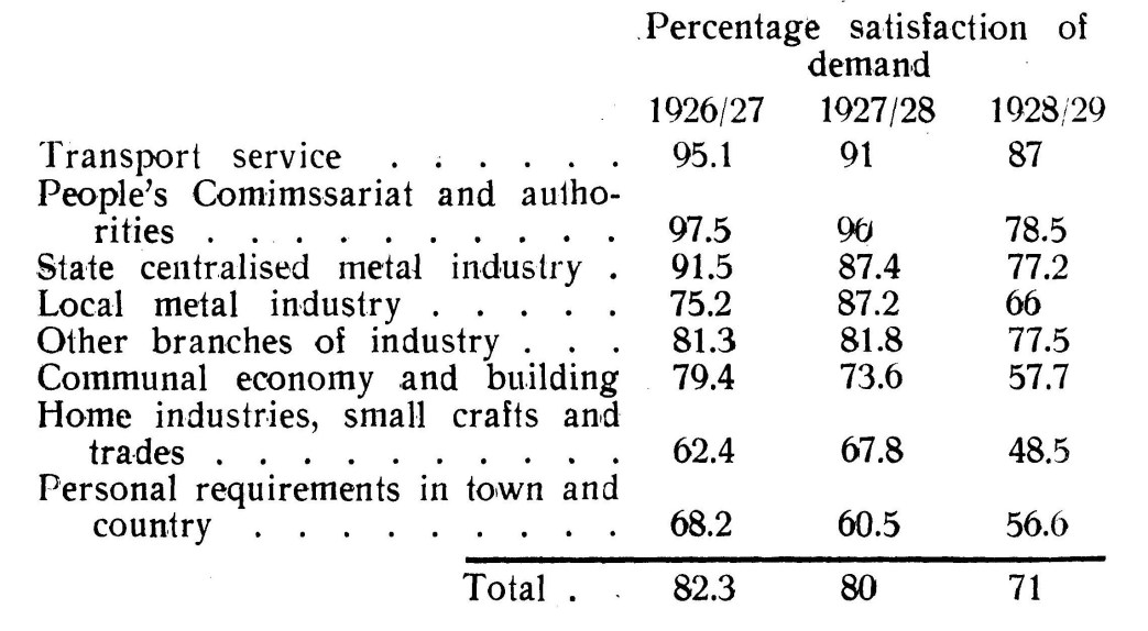 It is an unfortunate fact that the Five-Year Plans for industry deal with the question of goods famine just as they deal with the question of reserves. The report of the “Economisheskaya Snisn”, speaking of the draft, observes that here the balance between demand and supply is lacking. (C.f. Comrade Meschlauk’s speech). When a plan drawn up during a supply crisis fails to analyse thoroughly the question of the balance between demand and supply, this is no “external” oversight, no “formal” omission, but a profound internal fault. The acuteness of the goods shortage must certainly be alleviated, and not in some remote future, but during the next few years. The first steps in this direction must be made at once.