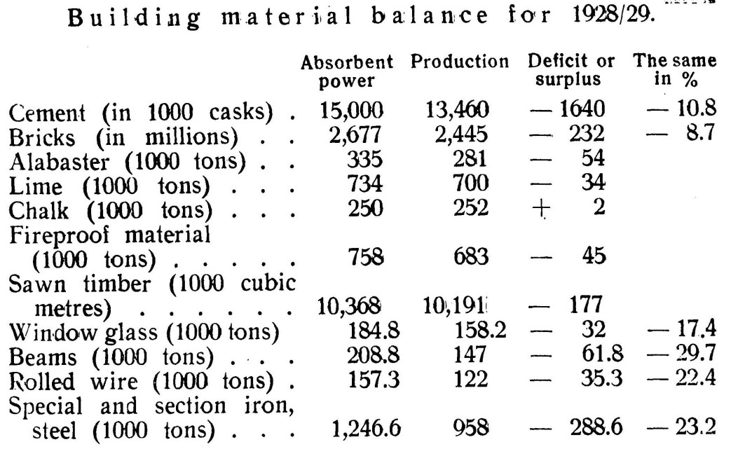 These data show that even if measures are being taken with respect to bricks and cement (although 8.6 and 10.8 per cent. Still represent a more than “fairly large” deficit), still foe shortage of glass, beams, wire, section iron and steel, is extremely great. The writer of the article (Barsky: “The building material industry”, “Ekonomitsheskaya Shisn”, No. 220) furnishing the above figures has unfortunately not staled on what physical growth of building work he bases his calculation. If this estimate of the deficit is correct, then we are faced with a somewhat complicated task: How are we going to build if we have 20 per cent less building material than we need? Can we not make an exacter calculation, and draw up a more accurate programme, based on real and not imaginary beams and iron?