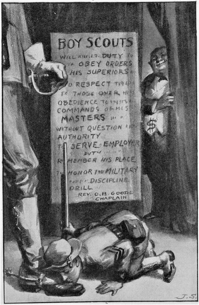 General Leonard Wood says: “There is no doubt that a boy who makes a good scout will make a good soldier.” Lieutenant-Colonel Lister believes that “from the Boy Scouts the future soldier joins the junior reserve officers’ training corps in high school, then he becomes a member of the senior R.O.T.C.,” and so on until he becomes a full-fledged professional butcher.
