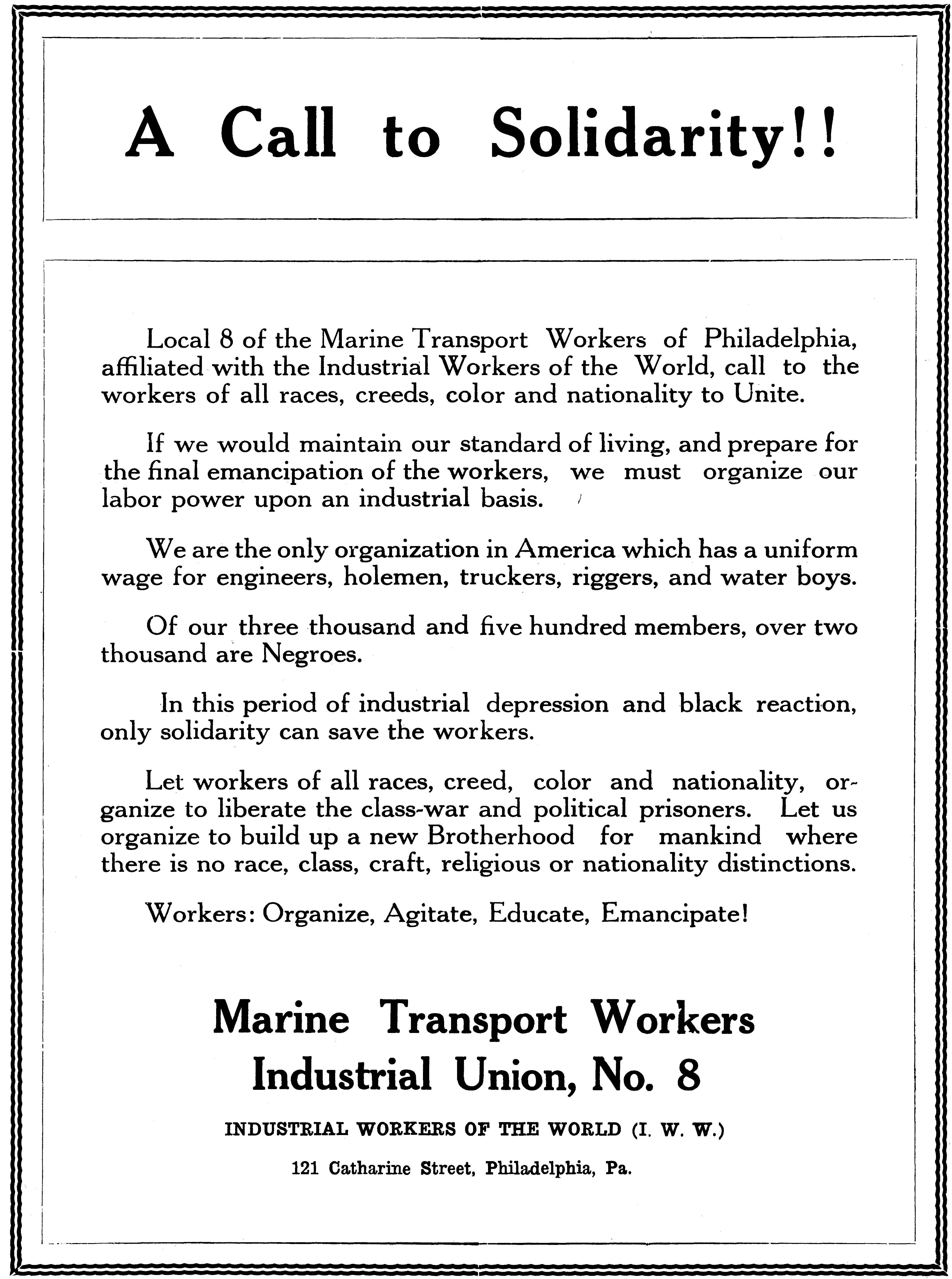Recognizing this fact, Local 8 of the Marine Transport Workers of Philadelphia, has, in accordance with its general policy of enlightened, militant, revolutionary action, proceeded to arrange an intensive campaign of education and agitation in the interest of the 118 class-war and political prisoners still languishing in prison.