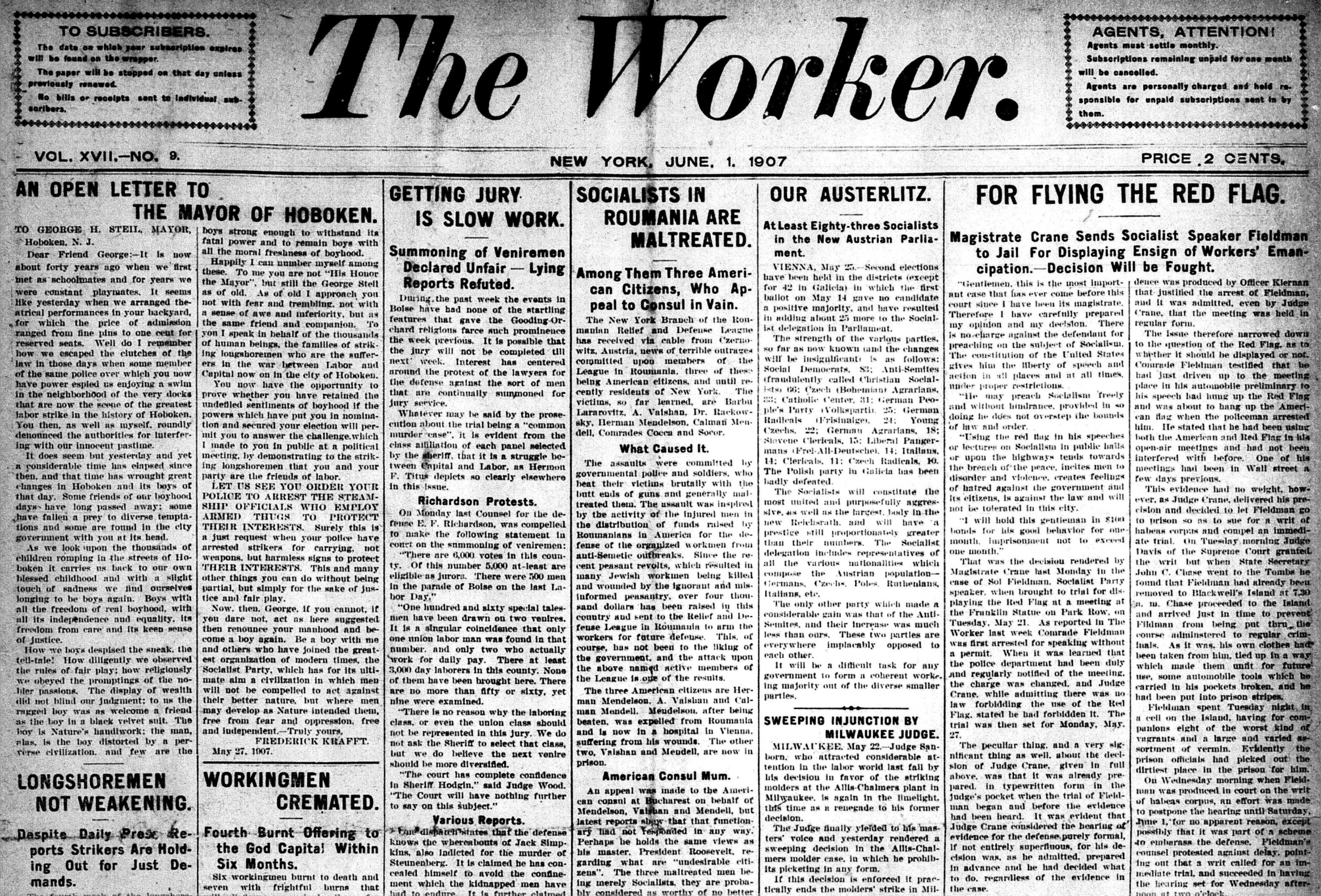 The Worker, and its predecessor The People, emerged from the 1899 split in the Socialist Labor Party of America led by Henry Slobodin and Morris Hillquit, who published their own edition of the SLP’s paper in Springfield, Massachusetts. Their ‘The People’ had the same banner, format, and numbering as their rival De Leon’s. The new group emerged as the Social Democratic Party and with a Chicago group of the same name these two Social Democratic Parties would become the Socialist Party of America at a 1901 conference. That same year the paper’s name was changed from The People to The Worker with publishing moved to New York City. The Worker continued as a weekly until December 1908 when it was folded into the socialist daily, The New York Call.