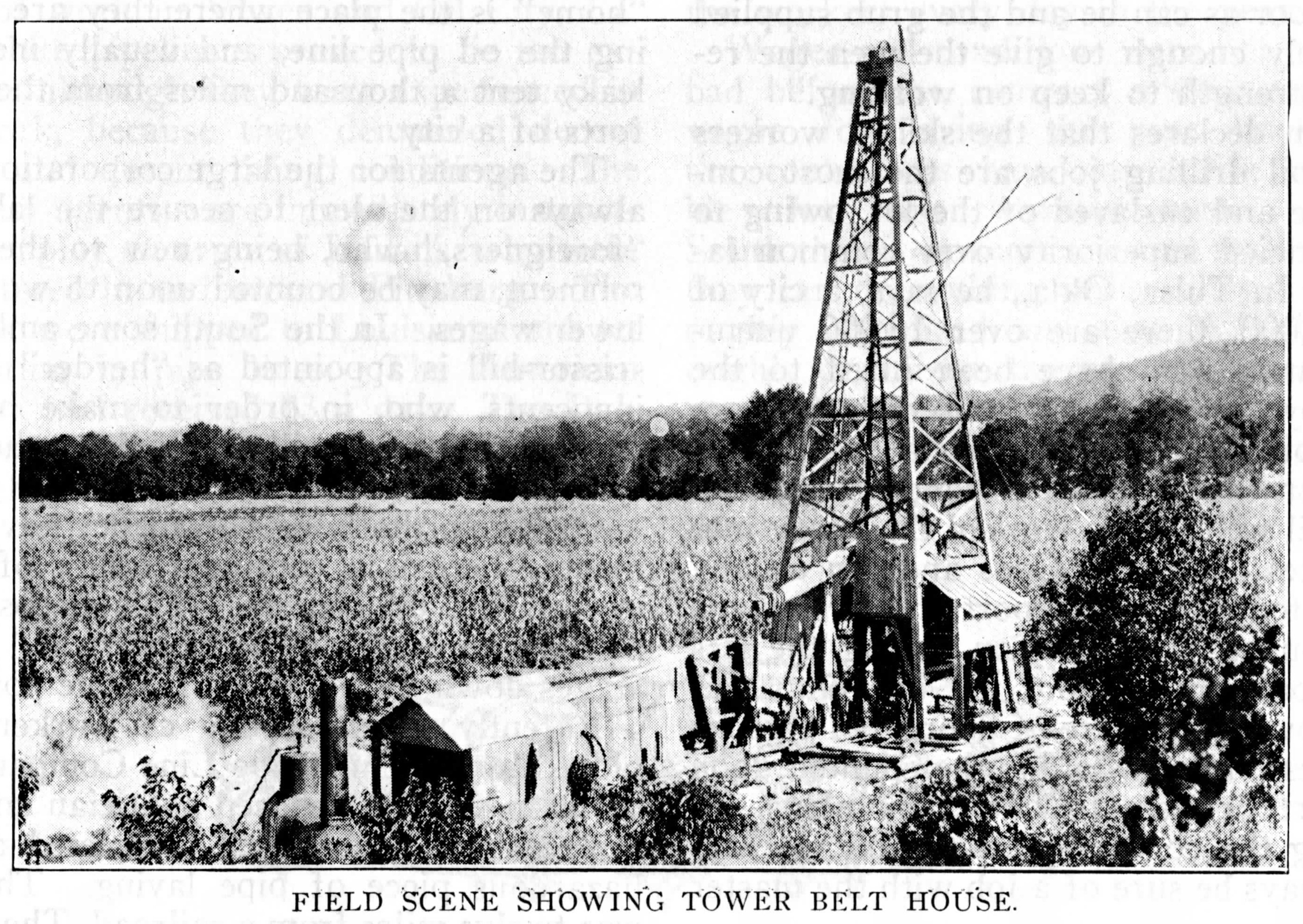 The steam boilers for drilling are heated by gas fire, the gas being pumped from some other well until gas is struck in the well being drilled itself. Then the gas is piped to the furnace and the oil well is drilled by its OWN GAS.