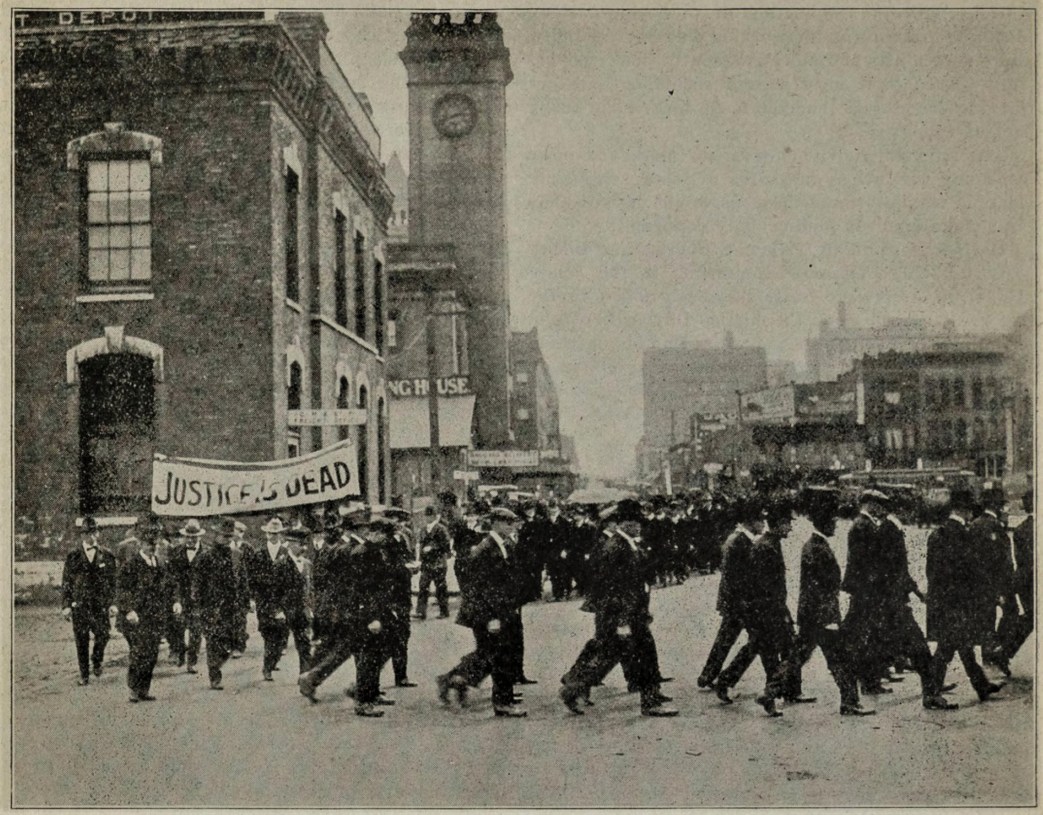 Most of the paraders marched by industries and left their craft banners at home as evidence of the uselessness of that form of organization. The only exceptions were the Printers, Bricklayers and Wood Workers and Cabinet Makers.