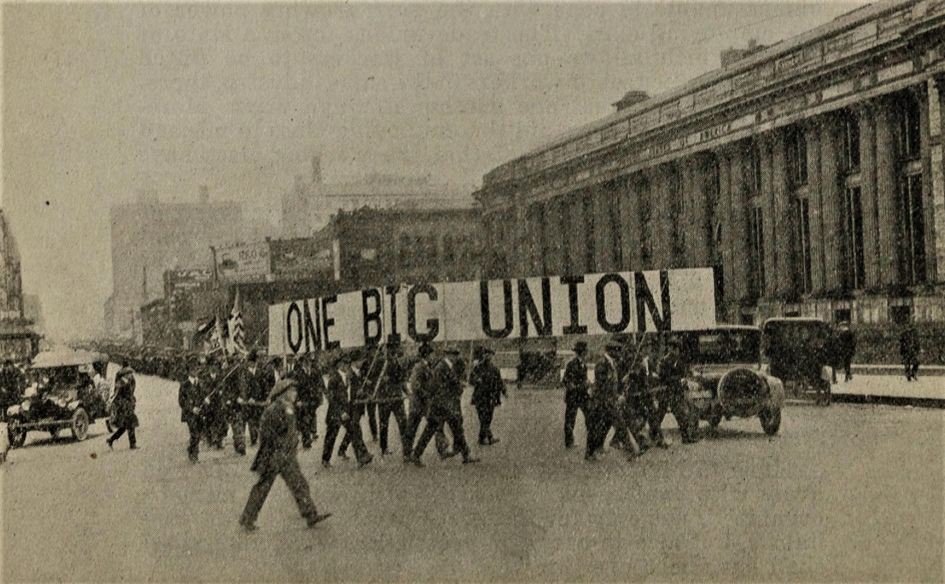 The parade was headed by the World War Veterans in uniform; next came a large thirty-foot banner inscribed “One Big Union.” Other banners were: “The Kaiser in a Palace in Holland; Debs in Jail in the United States; Is This Justice?” “Political Prisoners Have Been Released in Japan, France, Great Britain and Germany; Why Not Here?” “We Fought for Democracy ‘Over There’ and Now Have to Fight for a Living Wage When We Get Back.”