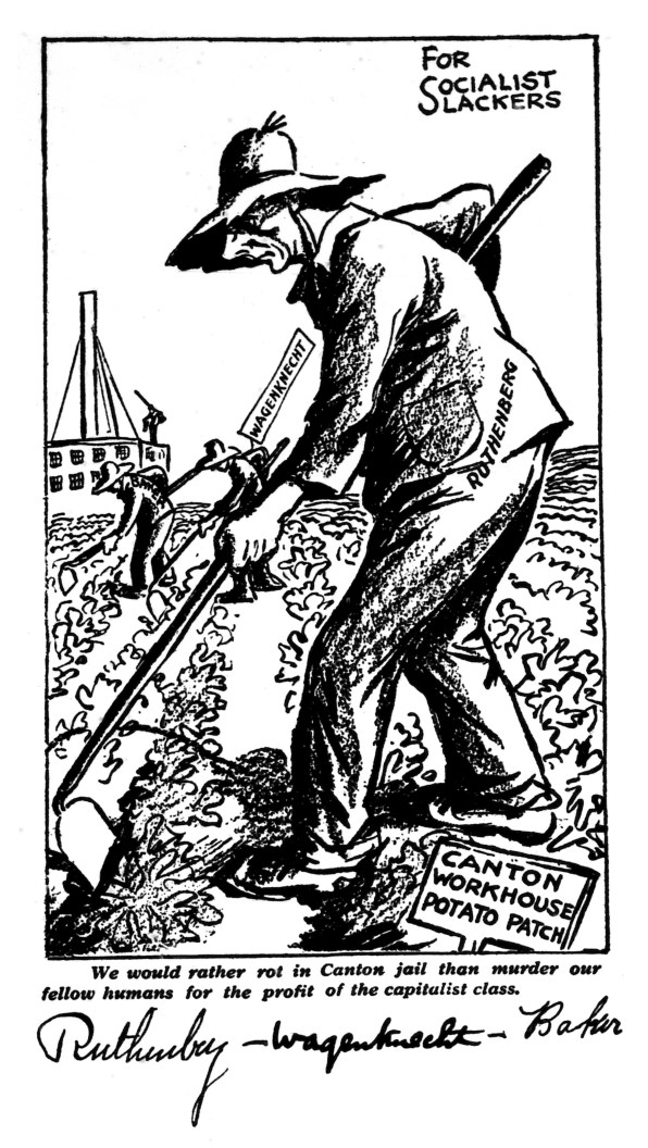 Altho the police are always in evidence at the meetings, as shown by the accompanying picture, and a court stenographer takes down the speeches for the federal authorities, the only trouble thus far has been the arrest of Alfred Wagenknecht, state secretary of the party, at a meeting held May 27th, and of Charles Baker, state organizer of Ohio, at one of the street meetings. Both comrades are charged with disorderly conduct. Comrade Wagenknecht was in the midst of an anti-conscription argument when stopped and Comrade Baker was arrested on the trumped up charge of a war patriot who tried to break up his meeting, that he had made disrespectful remarks about the flag. The Socialist News, local weekly of the party, has been withheld from the mails for two weeks, but hundreds of Reviews have been sold.