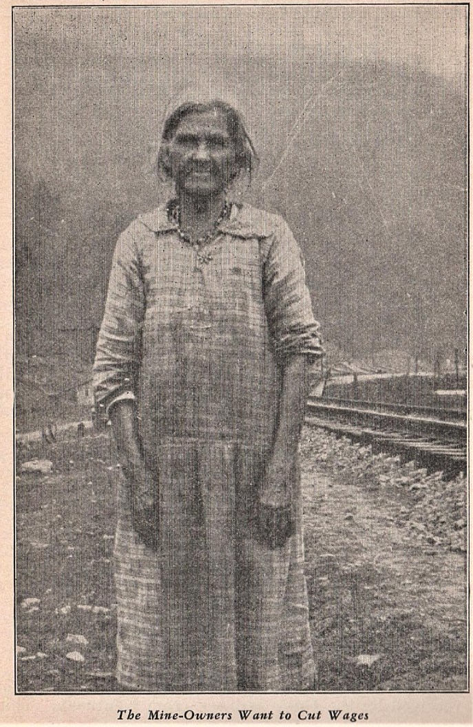 “We, the miners’ wives have to go to the company stores to draw the scrip what their husbands made the day before. (Scrip is paper issued by the company instead of money. The miners are forced to spend it at the company store.) If they get any, they only get a small allowance. The biggest part is taken for carbide. They cannot get much to eat because they have to buy supplies. When we go to the company stores the prices are so high we cannot buy our groceries or anything. Our children go without lunch. Sometimes they have a little beans and corn bread, but without anything on it. No nourishing food. That is the reason we have flux. There are many cases of flux (a starvation disease which kills off the majority of its victims). We don’t even know how many. We have many deaths.”