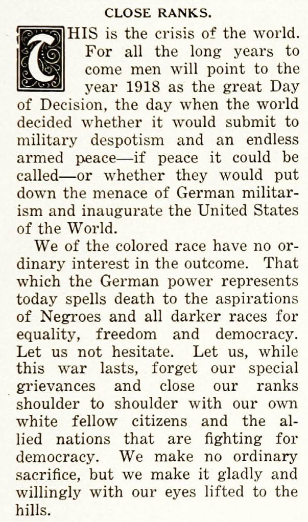 Dr. Du Bois first palpably sinned in his editorial “Close Ranks” in the July number of the Crisis. But this offense (apart from the trend and general tenor of the brief editorial) lies in a single sentence: “Let us, while this war lasts, forget our special grievances and close our ranks, shoulder to shoulder with our white fellow-citizens and the allied nations that are fighting for democracy.” From the latter part of the sentence there is no dissent, so far as we know. The offense lies in that part of the sentence which ends with the italicized words. It is felt by all his critics, that Du Bois, of all Negroes, knows best that our ‘‘special grievances” which the War Department Bulletin describes as “justifiable” consist of lynching, segregation and disfranchisement, and that the Negroes of America can not preserve either their lives, their manhood or their vote (which is their political life and liberties) with these things in existence. The doctor’s critics feel that America can not use the Negro people to any good effect unless they have life, liberty and manhood assured and guaranteed to them. Therefore, instead of the war for democracy making these things less necessary, it makes them more so.