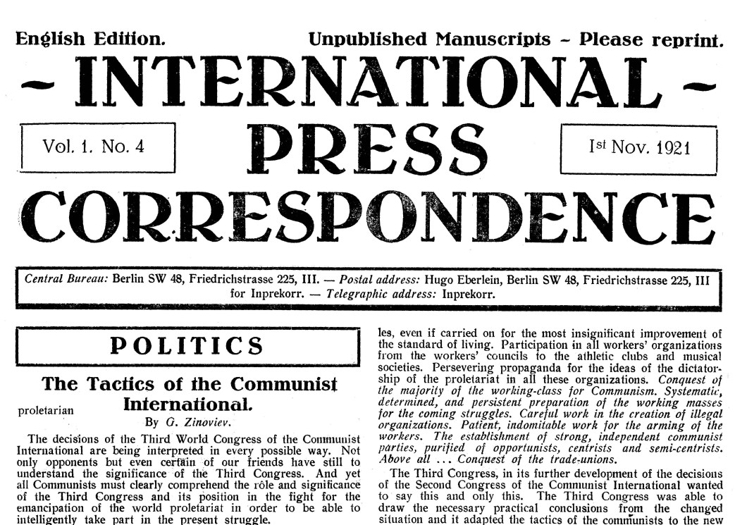 International Press Correspondence, widely known as”Inprecor” was published by the Executive Committee of the Communist International (ECCI) regularly in German and English, occasionally in many other languages, beginning in 1921 and lasting in English until 1938. Inprecor’s role was to supply translated articles to the English-speaking press of the International from the Comintern’s different sections, as well as news and statements from the ECCI. Many ‘Daily Worker’ and ‘Communist’ articles originated in Inprecor, and it also published articles by American comrades for use in other countries. It was published at least weekly, and often thrice weekly. The ECCI also published the magazine ‘Communist International’ edited by Zinoviev and Karl Radek from 1919 until 1926 monthly in German, French, Russian, and English. Unlike, Inprecor, CI contained long-form articles by the leading figures of the International as well as proceedings, statements, and notices of the Comintern. No complete run of Communist International is available in English. Both were largely published outside of Soviet territory, with Communist International printed in London, to facilitate distribution and both were major contributors to the Communist press in the U.S. Communist International and Inprecor are an invaluable English-language source on the history of the Communist International and its sections.
