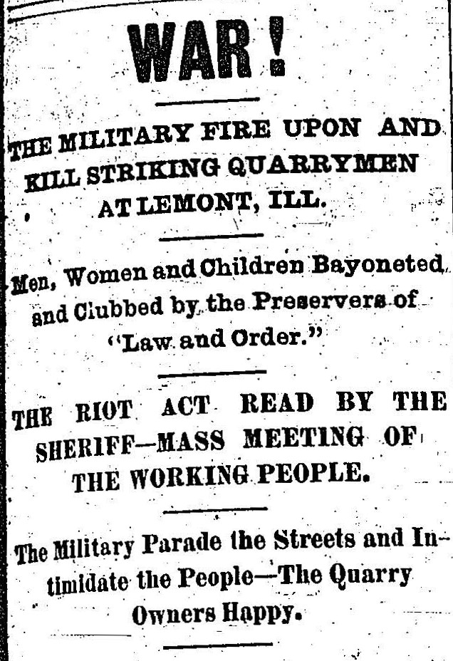 Given that this is the United States, it is unsurprising that there are massacres I’ve not heard of before. A year before Haymarket, workers’ leader and ‘Alarm’ editor traveled to the quarry town of Lemont outside of Chicago and wrote this marvelous report on the fight of the stone cutters. We have a history.