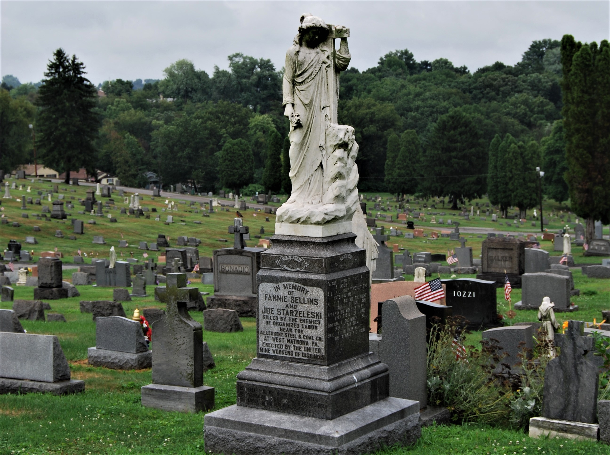 Fannie Sellins’ grave stands in New Kensington on the Alleghany River. The tombstone, erected by the United Mine Workers of District No. 5, stands as a monument to those “killed by the enemies of organized labor”.