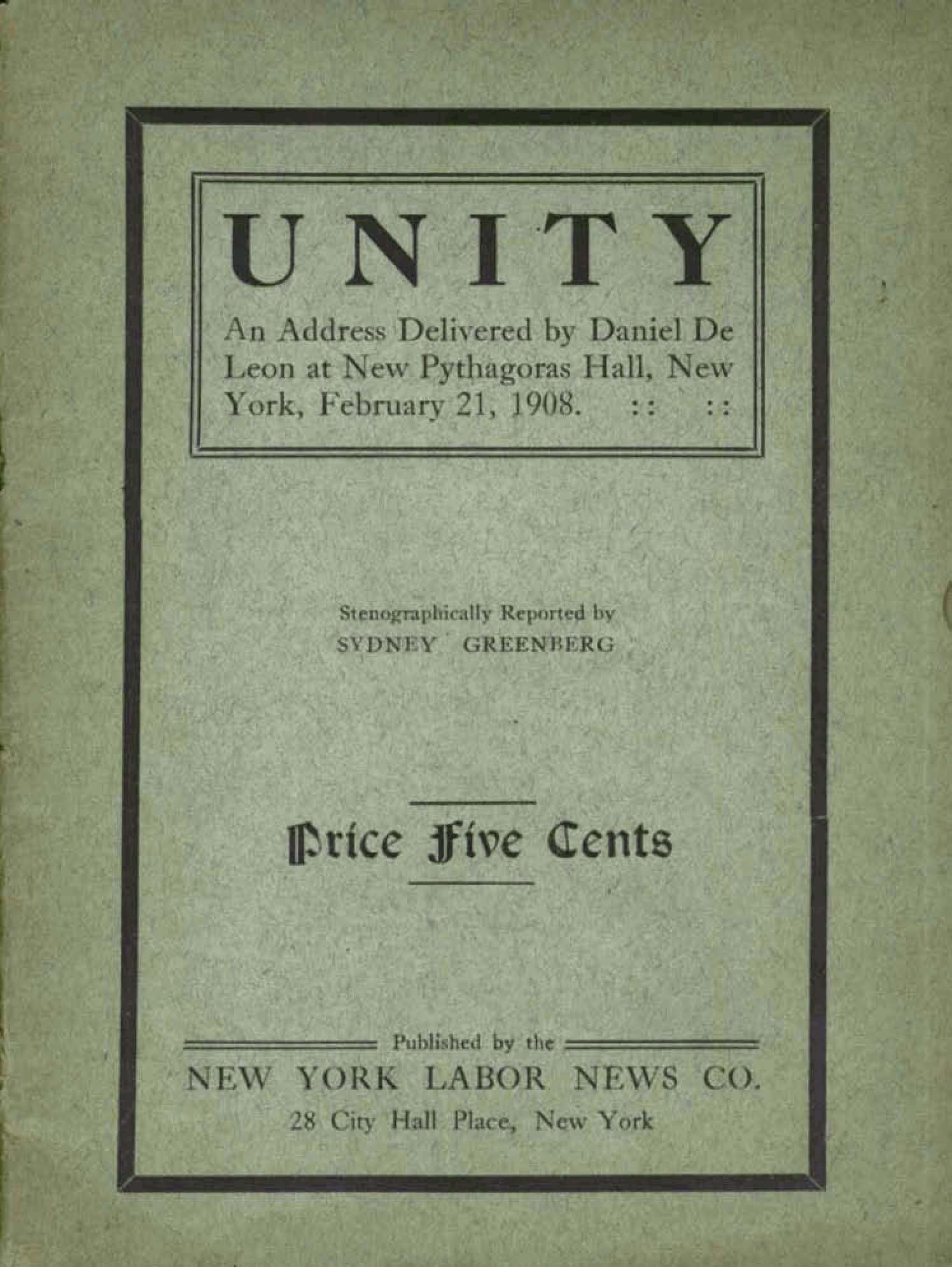 ‘Unity: An Address Delivered at New Pythagoras Hall, New York, February 21, 1908’ by by Daniel De Leon. New York Labor News, 1908.