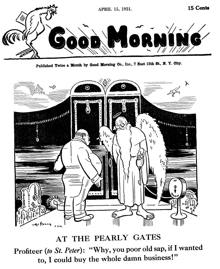 Good Morning was a (wonderful) left-wing illustrated humor magazine published bi-weekly from May 1919 until October 1921 by Ellis O. Jones and legendary radical cartoonist Art Young. Both had worked together earlier on The Masses. Good Morning was funded by donations and was forced to decrease in frequency from weekly to semi-monthly to monthly with a press run between 4 and 10 thousand, finally folding in late 1921.