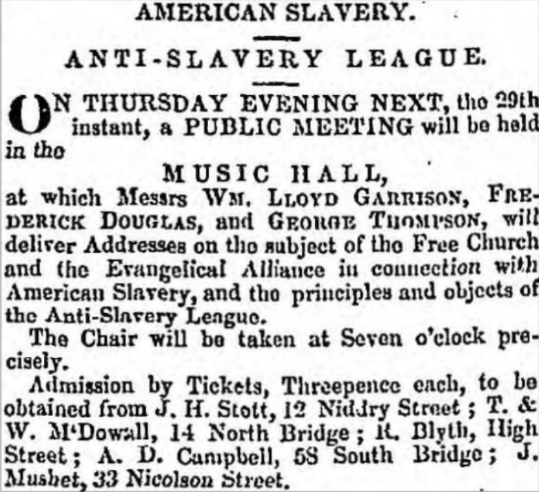 The Anti-Slavery League employed and paid Frederick Douglas for a time as an agitator for the anti-slavery cause, and he and the president of the League, George Thompson, made extended trips throughout the land and called forth great sympathy in behalf of the slaves.