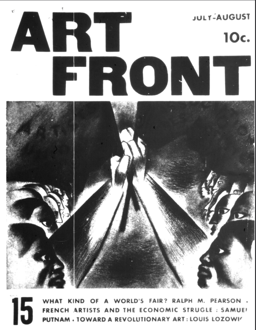 Art Front was published by the Artists Union in New York between November 1934 and December 1937. Its roots were with the Artists Committee of Action formed to defend Diego Rivera’s Man at the Crossroads mural soon to be destroyed by Nelson Rockefeller. Herman Baron, director of the American Contemporary Art gallery, was managing editor in collaboration with the Artists Union in a project largely politically aligned with the Communist Party USA.. An editorial committee of sixteen with eight from each group serving. Those from the Artists Committee of Action were Hugo Gellert, Stuart Davis, Zoltan Hecht, Lionel S. Reiss, Hilda Abel, Harold Baumbach, Abraham Harriton, Rosa Pringle and Jennings Tofel, while those from the Artists Union were Boris Gorelick, Katherine Gridley, Ethel Olenikov, Robert Jonas, Kruckman, Michael Loew, C. Mactarian and Max Spivak.