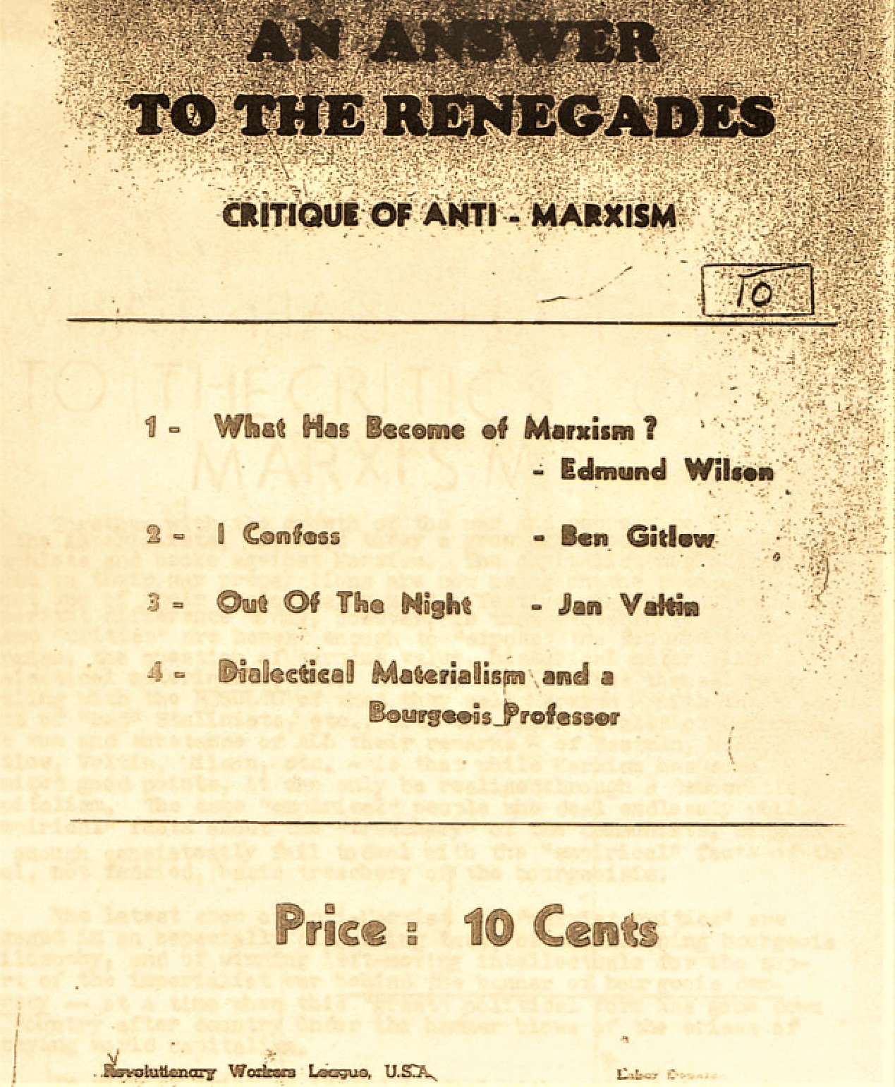 Contents: What Has Happened to the Critics of Marxism: Edmund Wilson, Out of the Night: Jan Valentin, Dialectical Materialism and a Bourgeois Professor, I Confess: Ben Gitlow.
