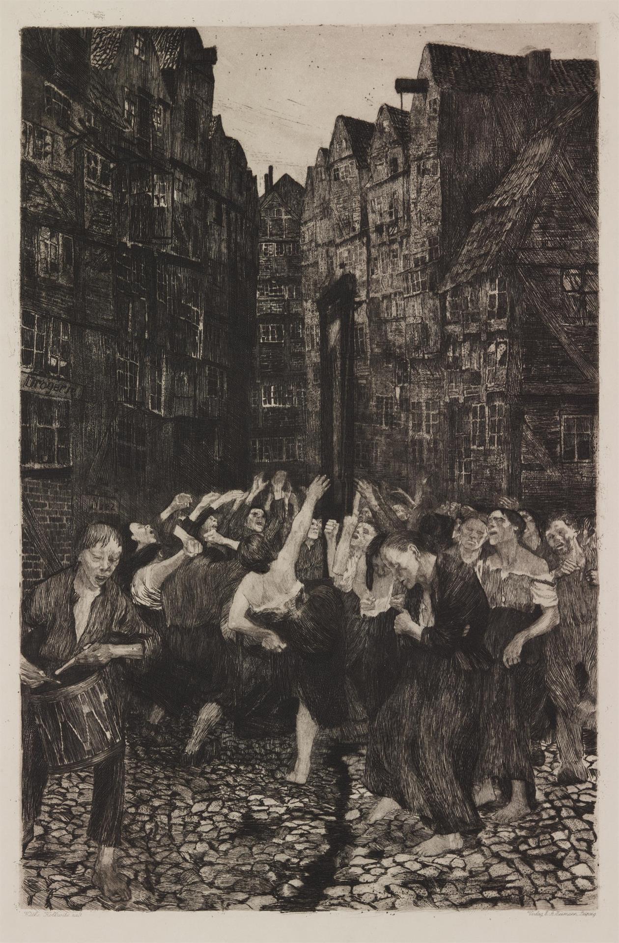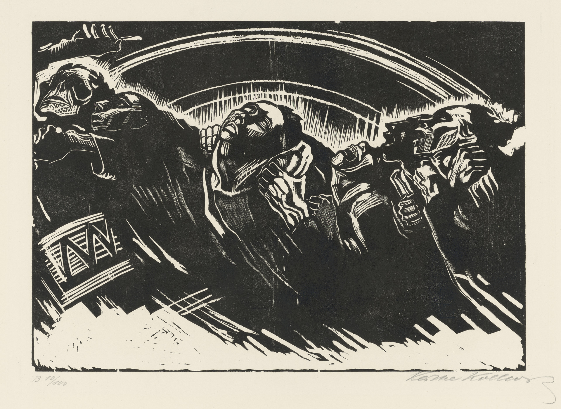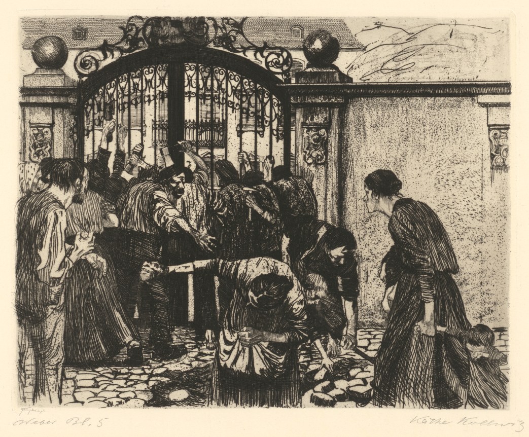 Kathe Kollwitz is sometimes referred to as the artist of social misery. But she is more than that, although it is true that the dark side of life of the poor has occupied her more than the joyous. One of her etchings bears the inscription “Aus vielen Wunden blutest du, O Volk” — “You bleed from many wounds, O People.” And in that phrase is summed up her life-work, for she has indeed shown the wounds of “das Volk” to the world; she has pleaded, she has warned, and she has stormed the gates of heaven with them. In the first twenty years of her artistic activity her themes dealt chiefly with revolt, with uprisings and revolutions. We can follow this thread that runs through her life in all her famous works, the source of which were, as we have seen, literary.
