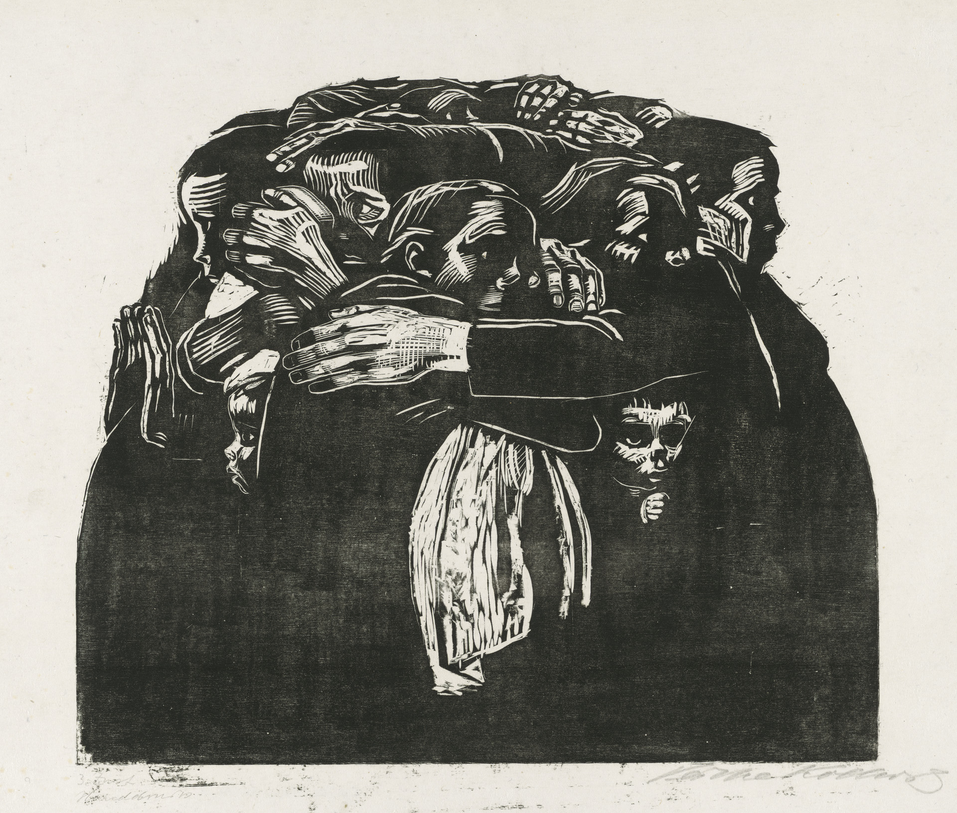 With the beginning of the world war, however, new motives crept into her work. Life itself becomes more overwhelming, more commanding than literature or history, and thenceforth her themes deal with poverty, famine, hunger, illness, death; the motif of deep human love, especially between mother and child, is predominant; the motif of death recurs endlessly. And since her art is an intimate part of her own life’s experience, we must know that her youngest son, a youth of 18, was one of the first volunteers in the war. She was deeply opposed to his enlisting. He was among the first soldiers to fall, and this tragedy in her own life may be studied in her war posters — in the misery of mothers waiting in death-like calm for news, in the posters of death; in crouching, animal-like forms expressing the grief of mothers over the dead bodies of their children. During the war she produced a series of seven woodcuts entitled “War,” all expressing the deepest human tragedy. One is entitled “The Volunteers” — faces of young men, insanely intoxicated, their eyes closed, following Death beating a drum; another entitled “The Mother,” picturing a woman, her face turned in fear in one direction as her outstretched arms enclose and try to protect many, many men, youth and boys; the last is “Das Volk” — in the foreground the form of “das Volk” — a face of calmness — unearthly calmness — surrounded by mad, fierce faces shrieking at it; and yet it remains calm.