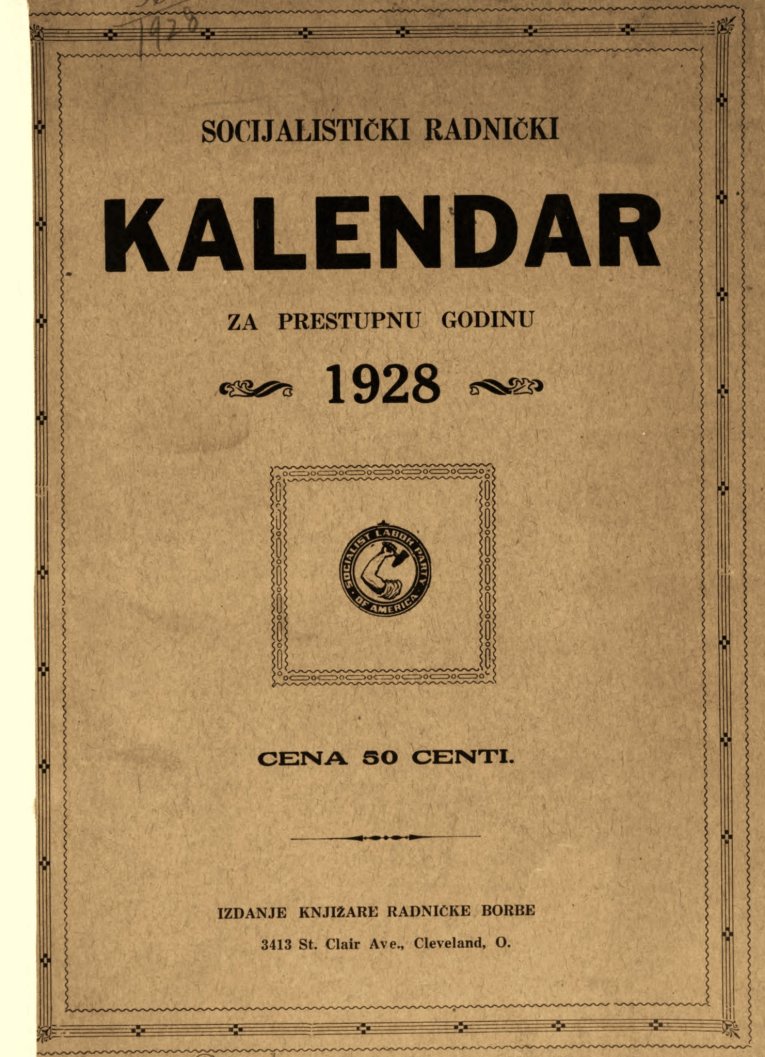 Socijalistički radnički kalenda, 1928. .Izdaje Jugoslavenski savez socijalističke partije rada. Izdanje Knjižare Radnicke Borbe, Cleveland, Ohio. 1928/ Socialist Labor Calendar, 1928. Published by the Yugoslav Union of the Socialist Labor Party, the Labor Struggle Bookstore, Cleveland, Ohio. 1928.