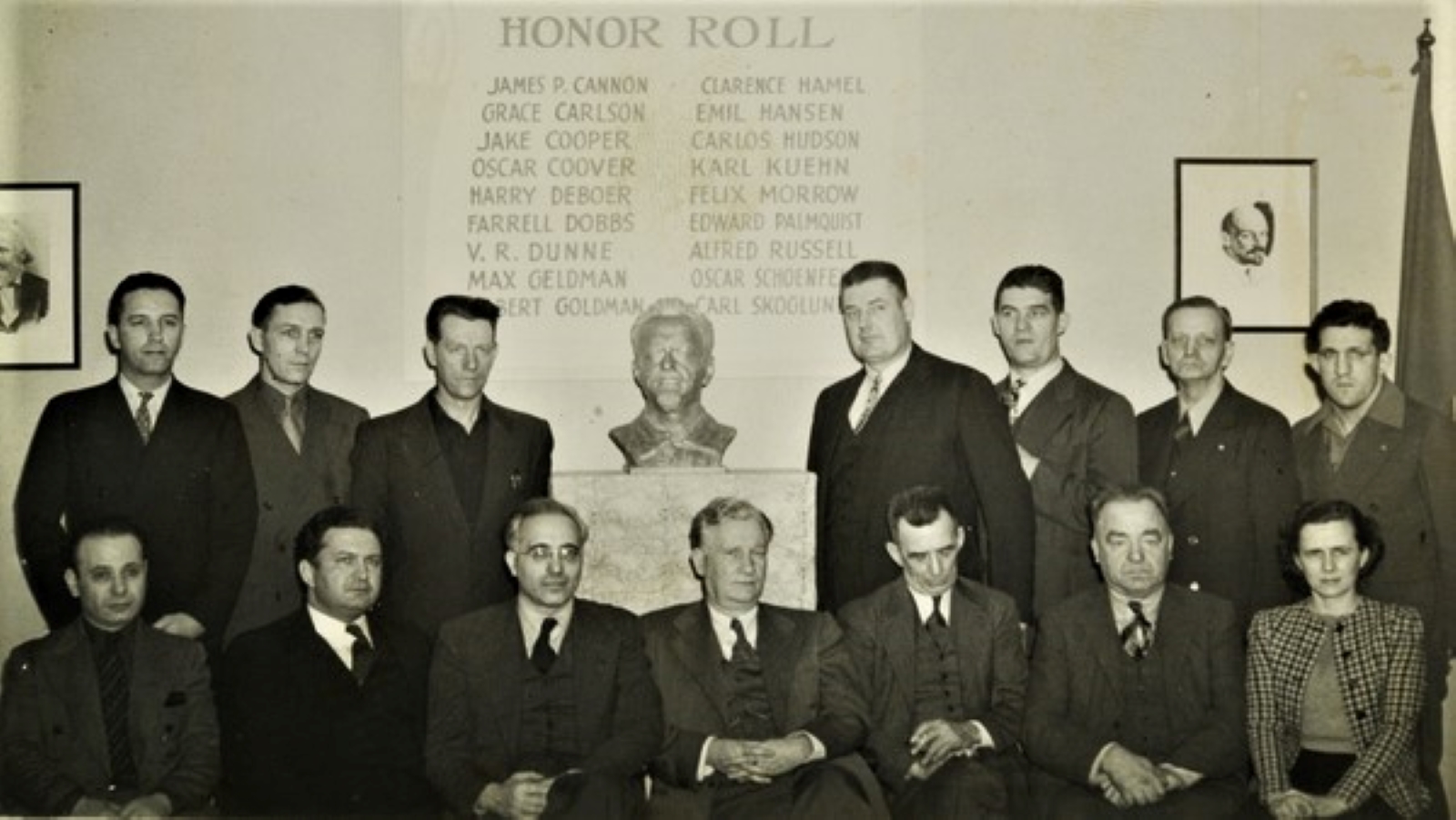 Socialist Workers Party members convicted under the Smith Act, 1941, back row l-r: Farrell Dobbs, Harry DeBoer, Edward Palmquist, Clarence Hamel, Emil Hansen, Oscar Coover, Jake Cooper; front row l-r: Max Geldman, Felix Marrow, Albert Goldman, James Cannon, Vincent Dunne, Carl Skoglund, Grace Carlson
