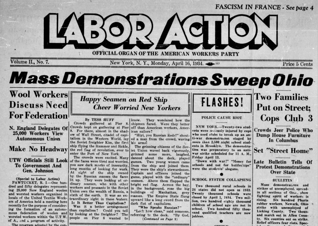 There are a number of periodicals with the name Labor Action in our history. This Labor Action was a bi-weekly newspaper published in 1933-34 by AJ Muste’s American Workers Party. The AWP grew from the Conference for Progressive Labor Action, founded in 1929, and Labor Action replaced the long-running CPLA magazine, Labor Age. Along with Muste, the AWP had activists and writers James Burnham and Art Preis. When the AWP fused with the Trotskyist Communist League of America in late 1934, their joint paper became The New Militant.